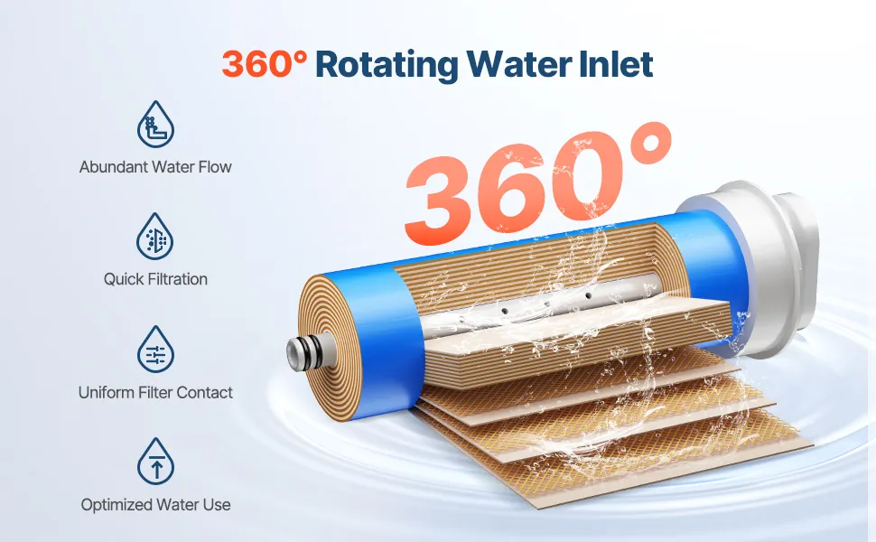 Innovative Mehrschichtfiltration: Unser tankloses RO-System unter der Spüle verfügt über eine fortschrittliche RO-Membrantechnologie mit einem um 360° drehbaren Wassereinlass, der eine gründliche Reduzierung der Verunreinigungen für saubereres, frischeres Wasser gewährleistet