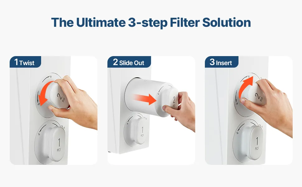 Ein einfaches Drehen und Ziehen genügt! Ersetzen Sie den Filter unseres tanklosen RO-Systems mühelos unter der Spüle, ohne Werkzeug oder Bewegen des Geräts. Freuen Sie sich über mühelose Filterwechsel in Sekunden.