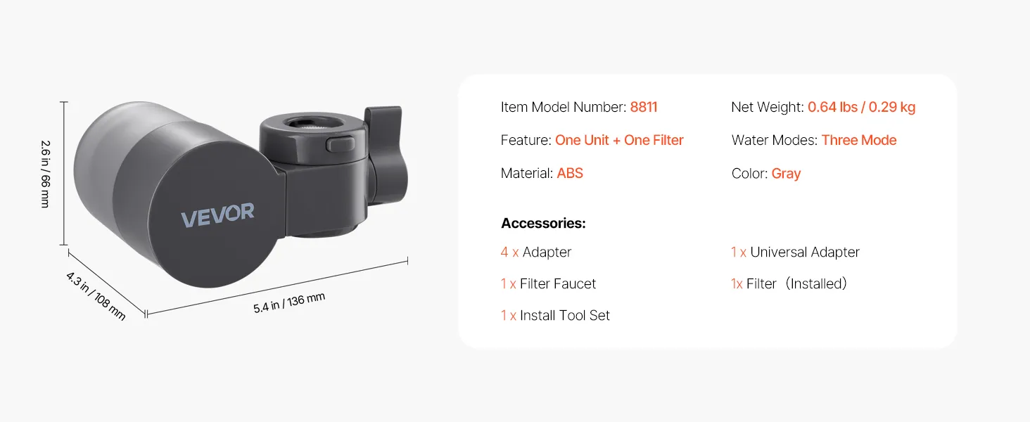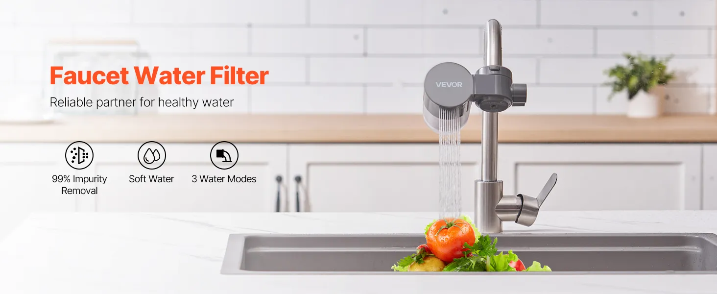 VEVOR Wasserfilter zur Wasserhahnmontage, horizontaler Wasserreiniger für Spülbecken, Kohlefaserfilter mit 1 Filter entfernt Chlor & Blei, für die meisten Küchen- oder Badezimmerarmaturen, grau