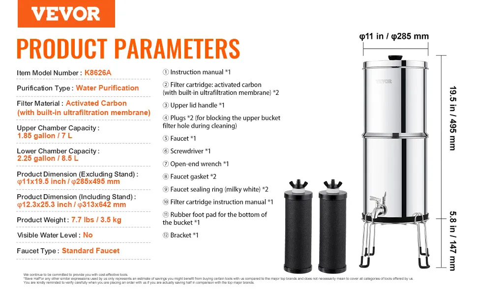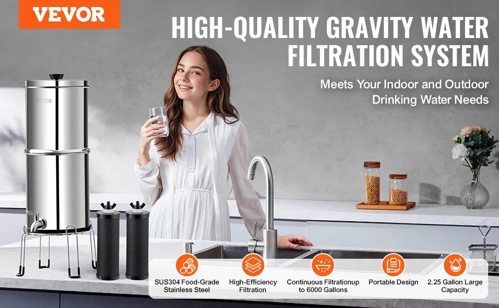 VEVOR Schwerkraft-Wasserfiltersystem, 2,25 G 304 Edelstahl-Arbeitsplatten-Wasserfiltersystem, reduziert Blei und bis zu 99 % Chlor, mit 2 Kohlefiltern/Zapfhahn/Ständer, für Zuhause, Camping, Wohnmobil