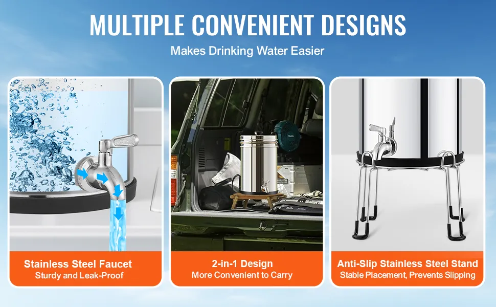 Tragbares großes Fassungsvermögen: Das Fassungsvermögen von 2,25 Gallonen entspricht dem Trinkwasserbedarf von 1 bis 4 Personen. Der Tischwasserfilter aus rostfreiem Stahl mit kompaktem Design halbiert das Lagervolumen und ist daher leicht zu transportieren.