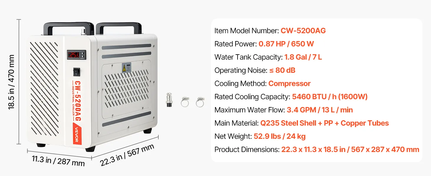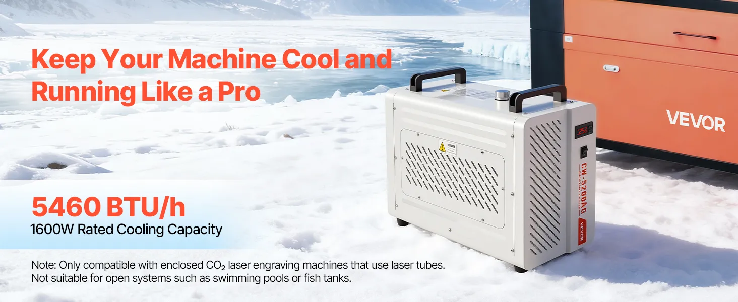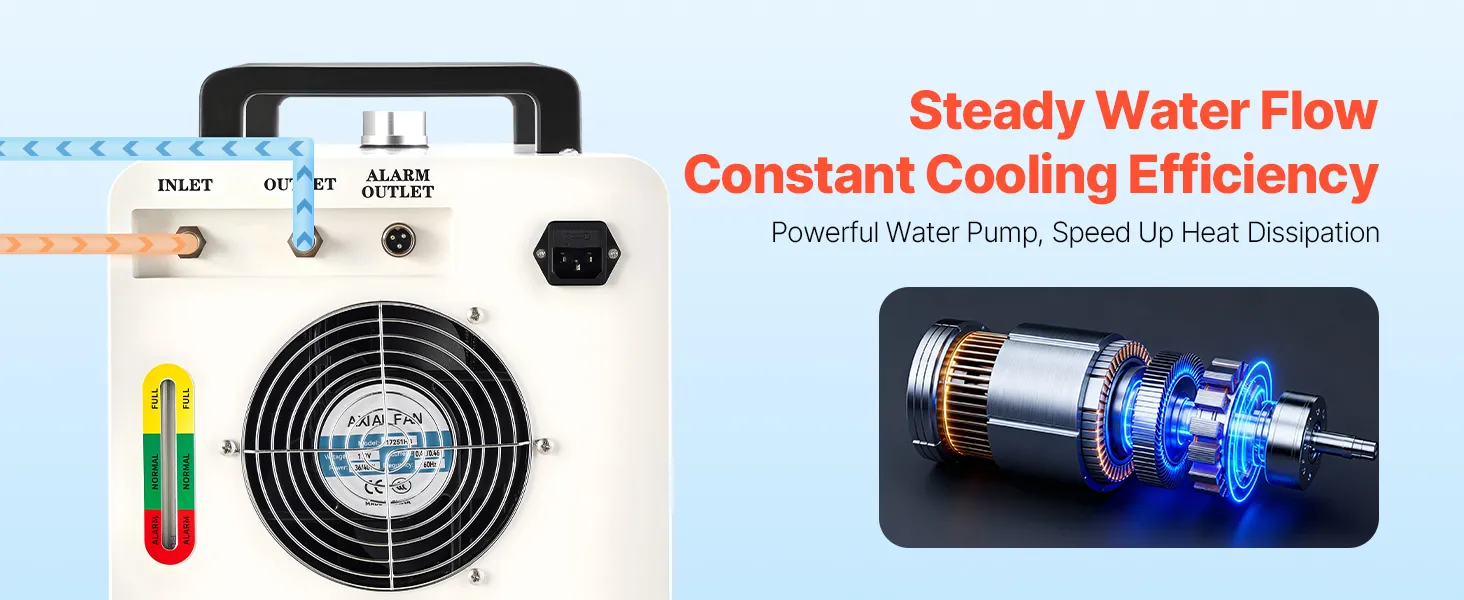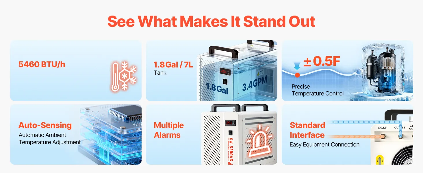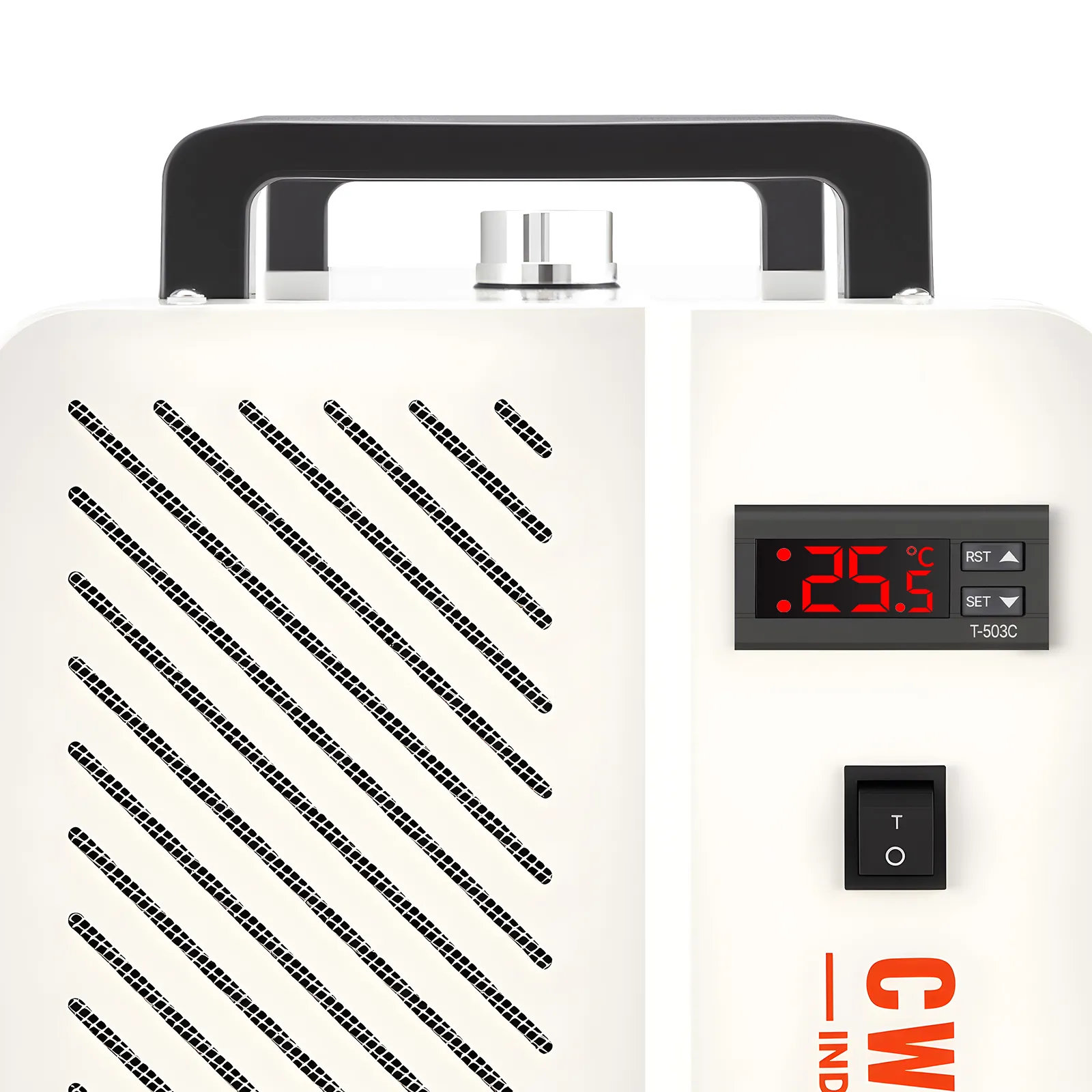 1,6 kW (5460 BTU/h) Kühlleistung: Dieser industrielle Wasserkühler verfügt über einen leistungsstarken Kompressor zur schnellen Wärmeabfuhr. Er ist für Laserröhren bis 150 W ausgelegt und sorgt im Vergleich zu luftgekühlten Kühlern für einen stabileren Betrieb von Lasergravierern und CNC-Maschinen