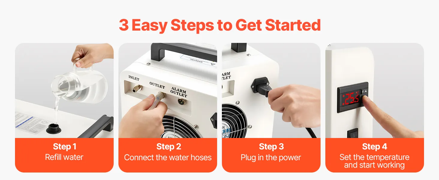 Einfache Installation: Dank standardmäßiger Ein- und Auslassgrößen ist dieser Industriewasserkühler mit den meisten Graviermaschinen, Lasersystemen und CNC-Maschinen kompatibel. Ein Luftfahrtanschluss für leckagefreie Verbindungen ist im Lieferumfang enthalten