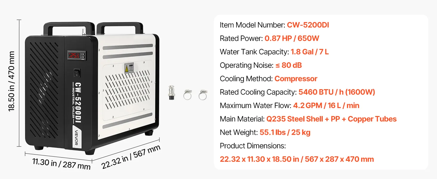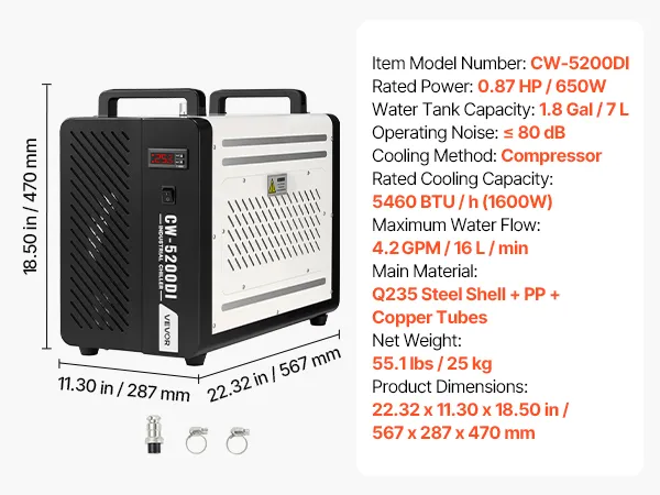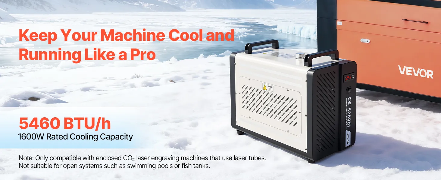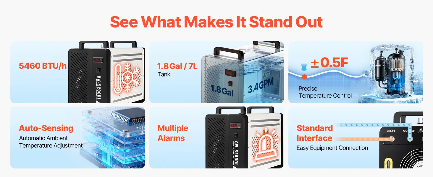 5460 BTU/h Cooling Capacity: This industrial water chiller features a powerful compressor to rapidly dissipate heat. Designed for laser tubes up to 150W, it keeps laser engravers and CNC machines running more stably compared to air-cooled chillers