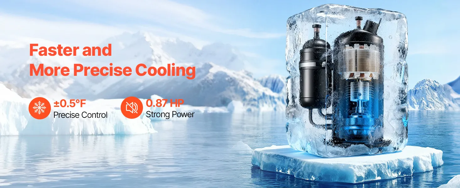 Dual Temperature Control Modes: In constant temperature mode, you can set your desired temperature, and the water chiller maintains it precisely within ±0.5°F (±0.28°C). In intelligent control mode, it automatically adjusts to the ambient temperature