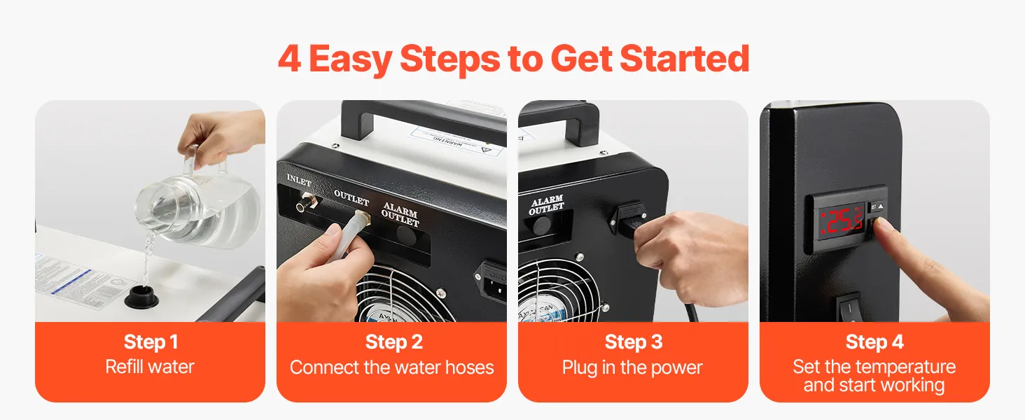 Installation Made Easy: Equipped with standard inlet and outlet sizes, this industrial water chiller is compatible with most engraving machines, laser systems, and CNC equipment. Includes an aviation connector for leak-free connection