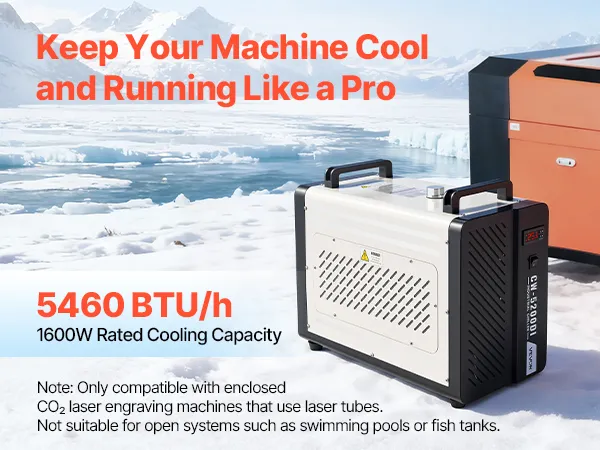 Designed with a powerful compressor and water pump to rapidly dissipate heat and maintain stable operation for laser engravers and CNC machines. Featuring constant temperature mode and intelligent control mode, and multiple alarm protections, it is ideal for cooling 90–150W laser tubes.