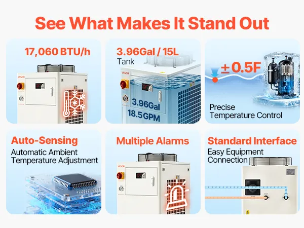 Schnelle Zirkulation, konstante Kühlung: Mit einem 15-L-(3,96-Gal)-Tank und einer maximalen Durchflussrate von 70 L/min (18,5 GPM) sorgt dieser Industriekühler für eine schnelle Zirkulation und effiziente Wärmeabfuhr. Dank des Sichtfensters wissen Sie genau, wann Sie nachfüllen müssen
