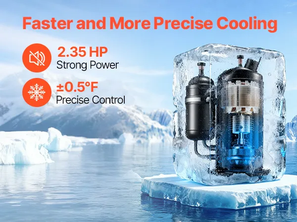 Zwei Temperaturregelungsmodi: Im Konstanttemperaturmodus können Sie die gewünschte Temperatur einstellen, die der Wasserkühler präzise innerhalb von ±0,28 °C (±0,5 °F) hält. Im intelligenten Regelungsmodus passt er sich automatisch der Umgebungstemperatur an