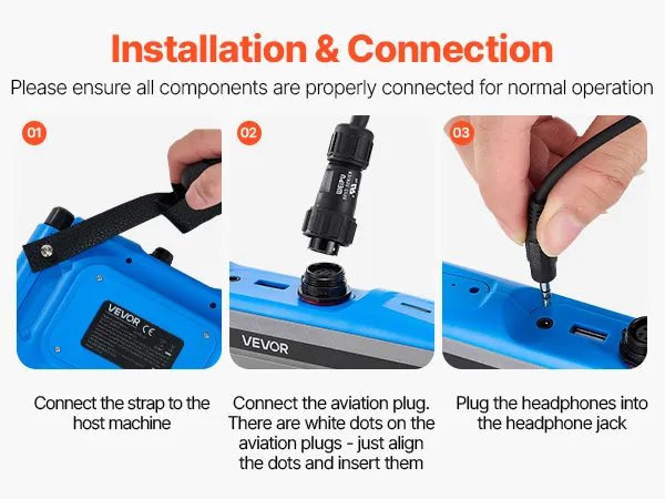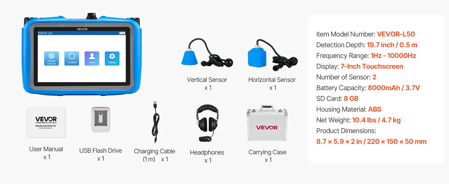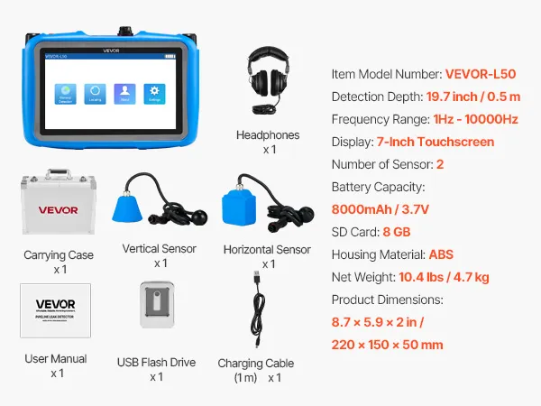 Der VEVOR Rohrleckdetektor bietet einen breiten Frequenzbereich von 1 Hz bis 10000 Hz und eine Erkennungstiefe von 0,5 m. Ausgestattet mit horizontalem und vertikalem Sensor, geräuschunterdrückenden Kopfhörern, 7-Zoll-Touchscreen und einem 8000-mAh-Hochleistungsakku für eine präzise und effiziente Lecksuche im Haus.