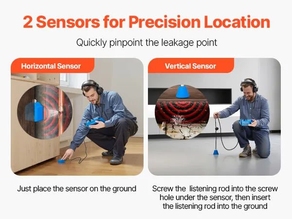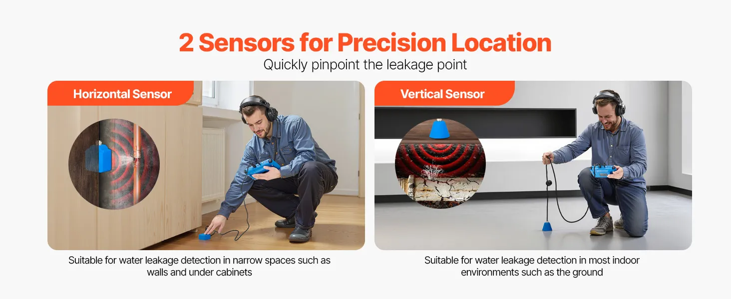 2 empfindliche Sensoren für den Innenbereich: Verwenden Sie den horizontalen Sensor in engen Räumen wie Wänden und unter Schränken, den vertikalen Sensor für die meisten Innenumgebungen wie den Boden und die Kopfhörer mit Geräuschunterdrückung, um Umgebungsgeräusche für eine genauere Leckerkennung zu filtern