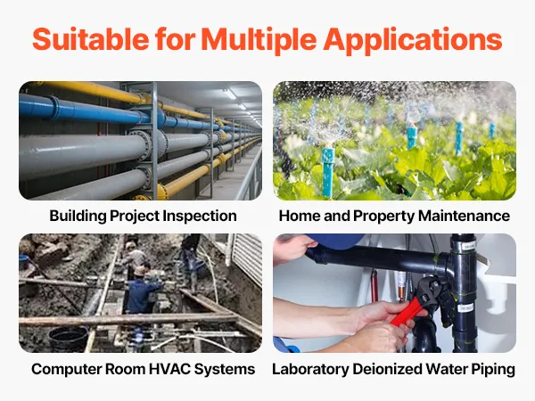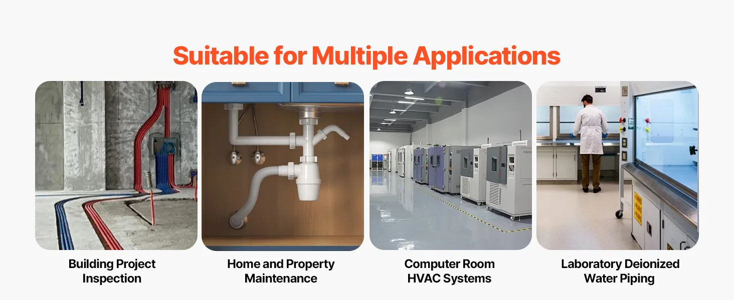 Vielfältige Anwendungsmöglichkeiten: Ideal für Inspektionen in Küchen, Bädern und Geräteräumen. Identifiziert schnell Lecks in Wasserleitungen, Fußbodenheizungen, Heizungs-, Lüftungs- und Klimakreisläufen und Sprinkleranlagen – spart Wasser, verlängert die Lebensdauer der Rohrleitungen und reduziert Verluste.