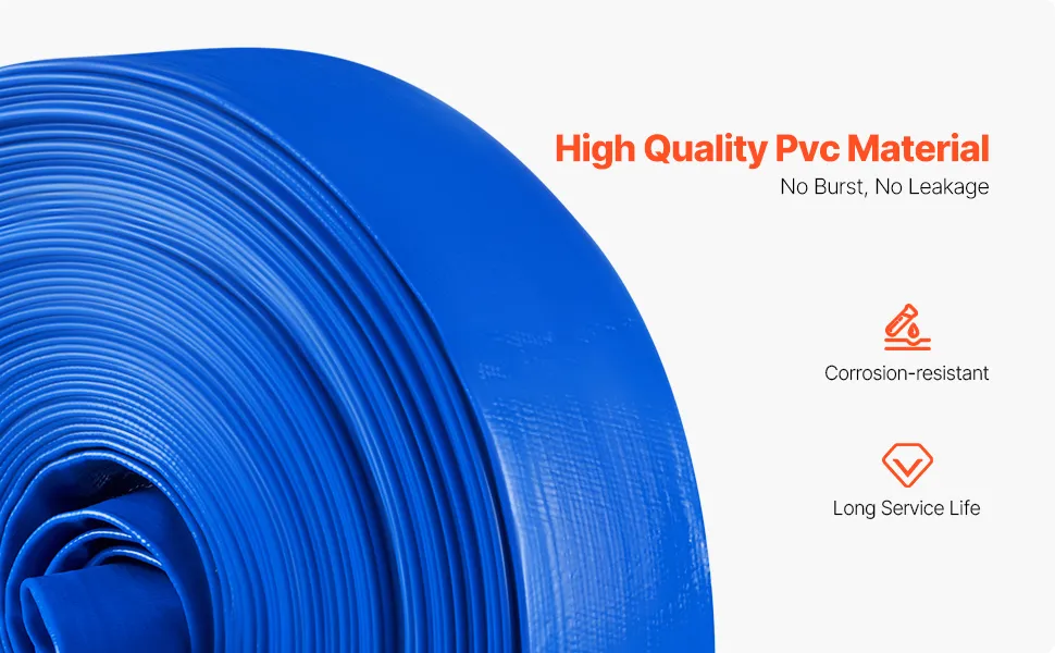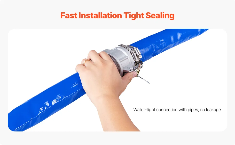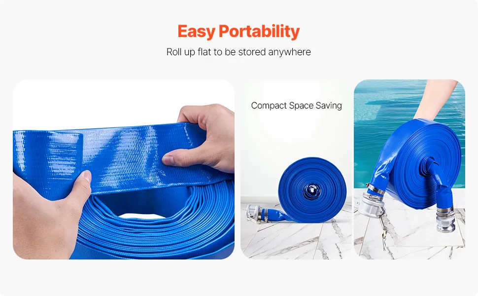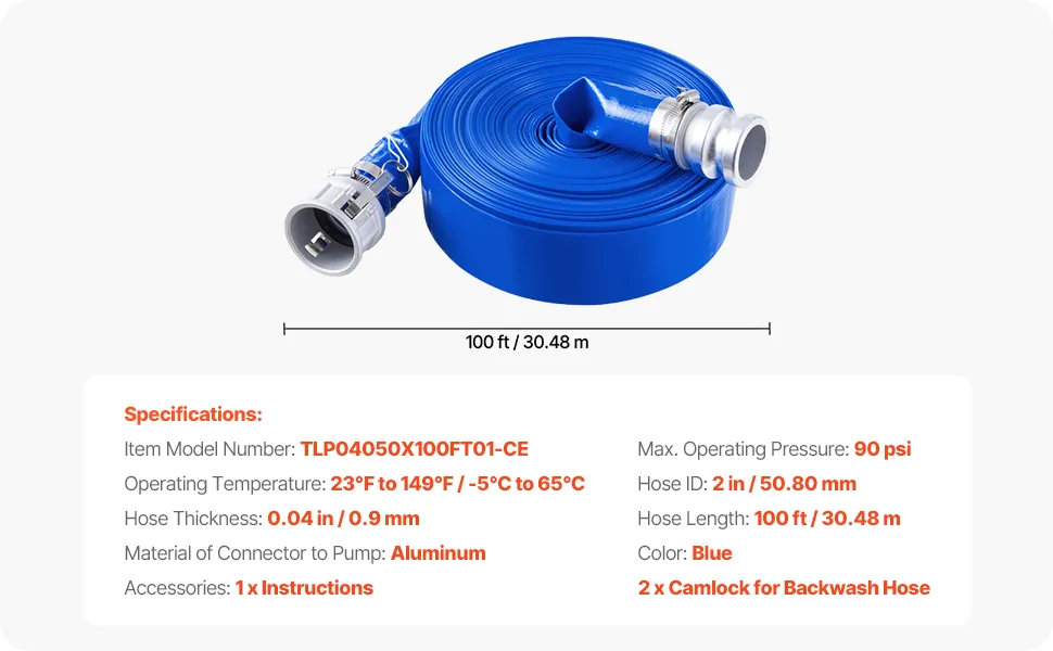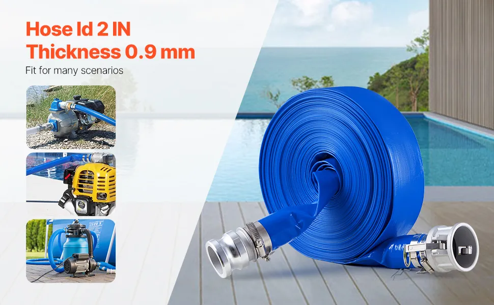 VEVOR Flachschlauch, 50,8 mm x 30 m, PVC-Abwasserschlauch, mit Klemmen, Camlock, Aluminiumbeschlägen, passend für verschiedene Pumpen, zur Abwasseraufbereitung, Wassertransport und weiteren Zwecken