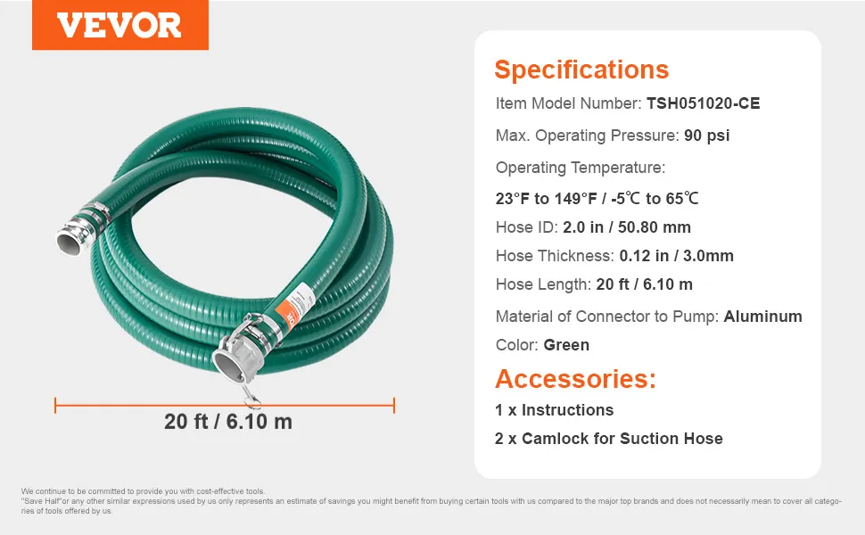 VEVOR Saugschlauch 2 Zoll x 20 Fuß / 50,80 mm x 6,10 m