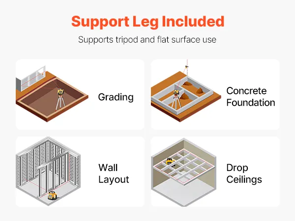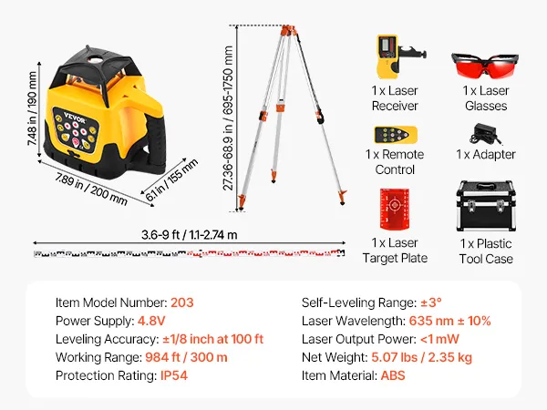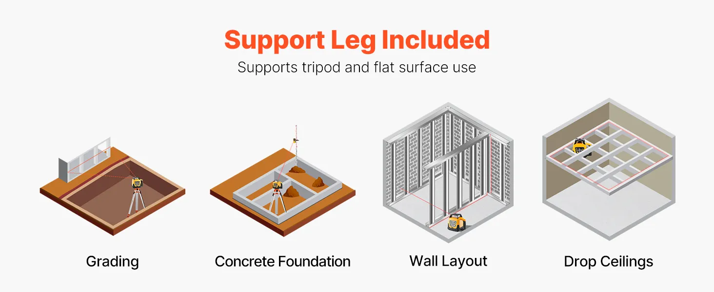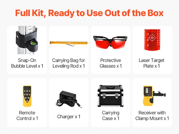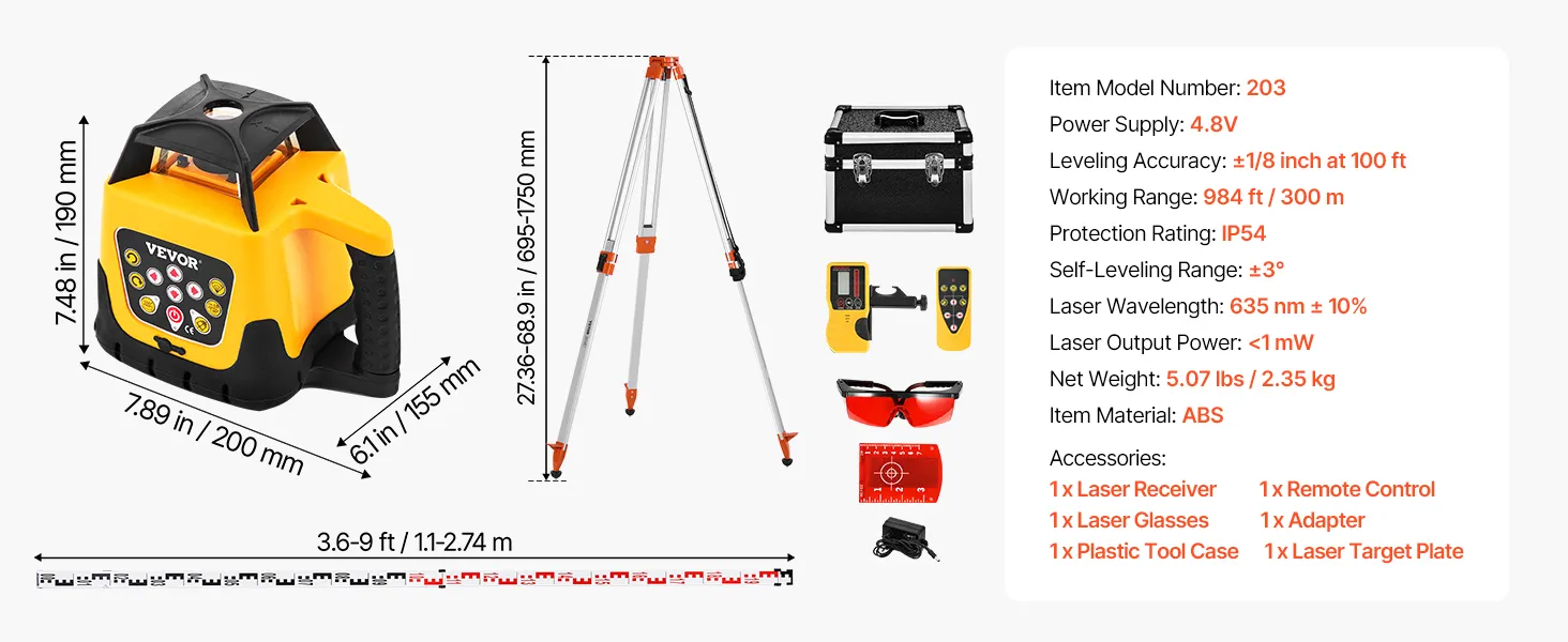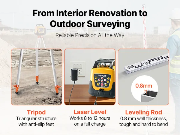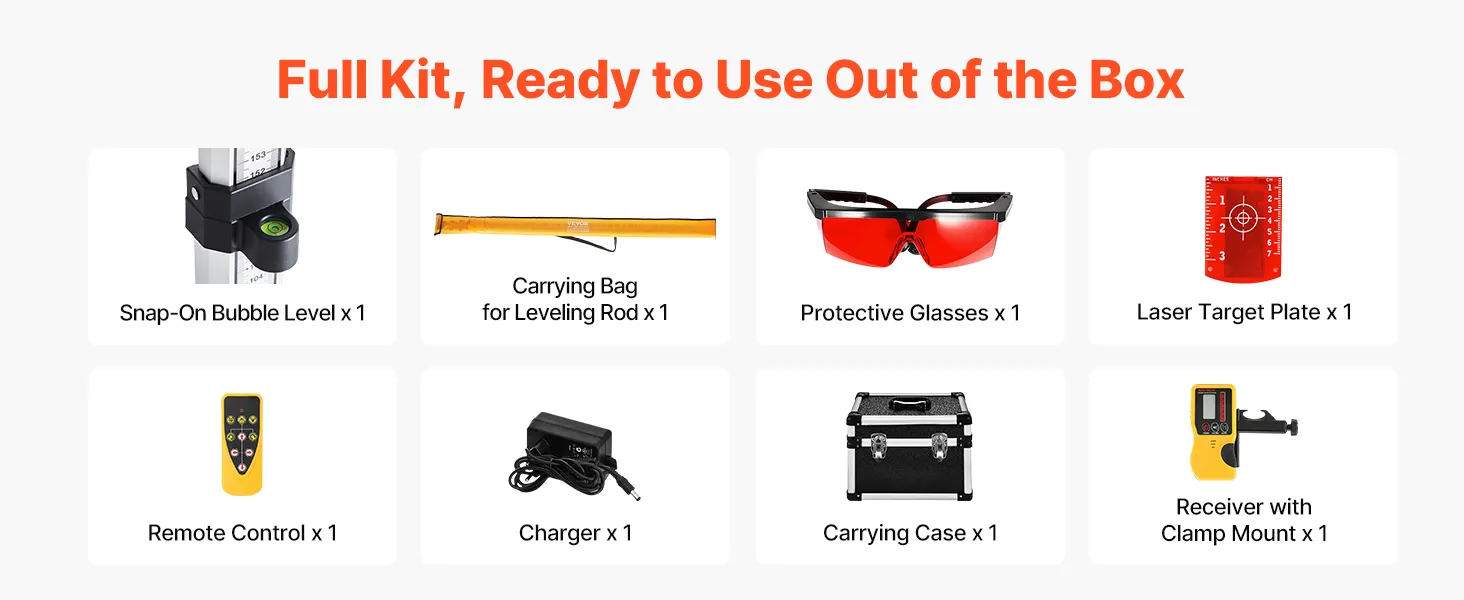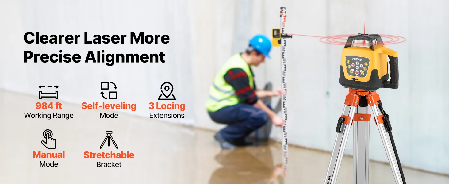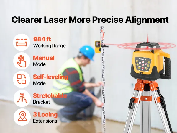 300 m Arbeitsdistanz: Unser Rotationslaser-Nivelliergerät bietet eine Arbeitsdistanz von 300 m und ein klares Lasersignal für industrielle und gewerbliche Anwendungen. Es wird mit einem Stativ und einer Messlatte geliefert, um Lasersignale präzise zu erfassen und auszuwerten.