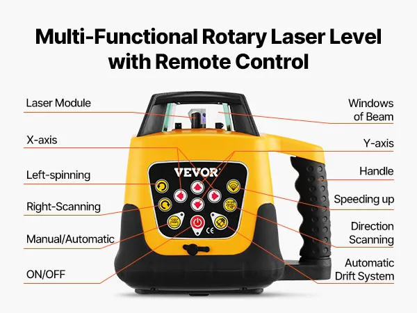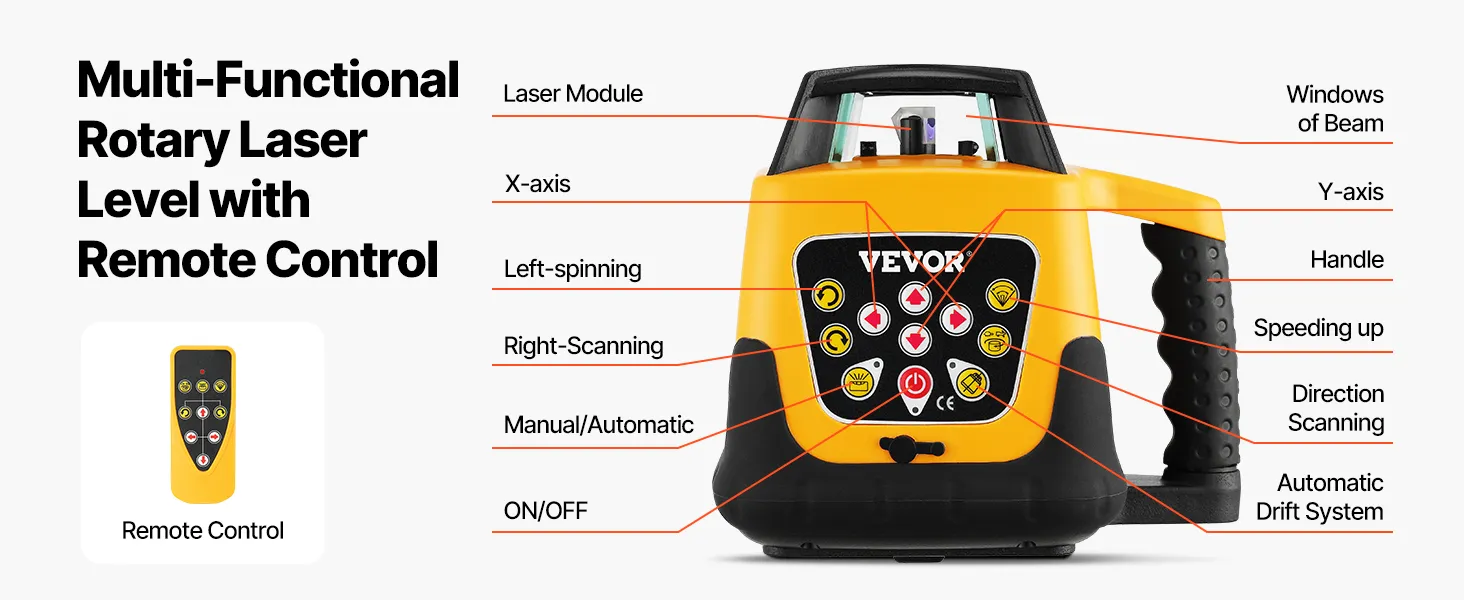 Behalten Sie die Kontrolle über Ihre Arbeit aus der Ferne! Unser Rotationslaser-Nivelliergerät wird mit einer praktischen Fernbedienung mit 20 Metern Reichweite geliefert, mit der Sie Einstellungen anpassen, Modi wechseln und bestimmte Bereiche scannen können, ohne sich physisch in der Nähe des Geräts befinden zu müssen.