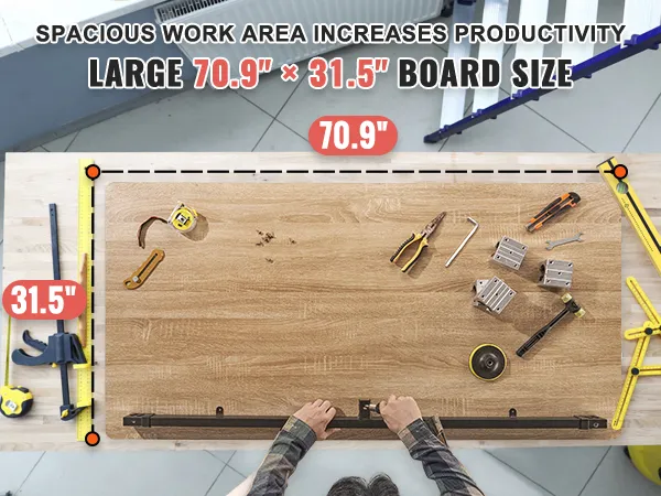 Unsere geräumige Tischplatte bietet Platz für alle Arten von Werkzeugen, Zubehör und Materialien und erfüllt eine Vielzahl von Anforderungen. Sie eignet sich ideal für die Holzbearbeitung, für Reparaturen oder auch für den Einsatz im Büro und zu Hause.
