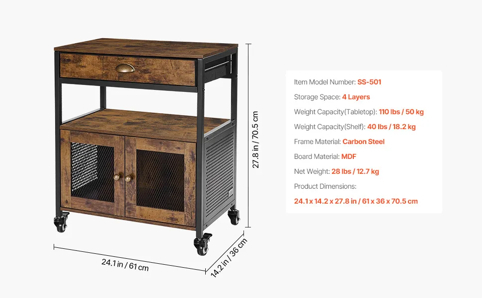 VEVOR Kaffeebarschrank 61 x 36 x 70,5 cm Kaffeebarschrank im Landhausstil mit 4-stufigem Stauraum, beweglicher Kaffeebartisch mit Rollen &Netztür, Sideboard-Buffetschrank für Küche Eingangsbereich