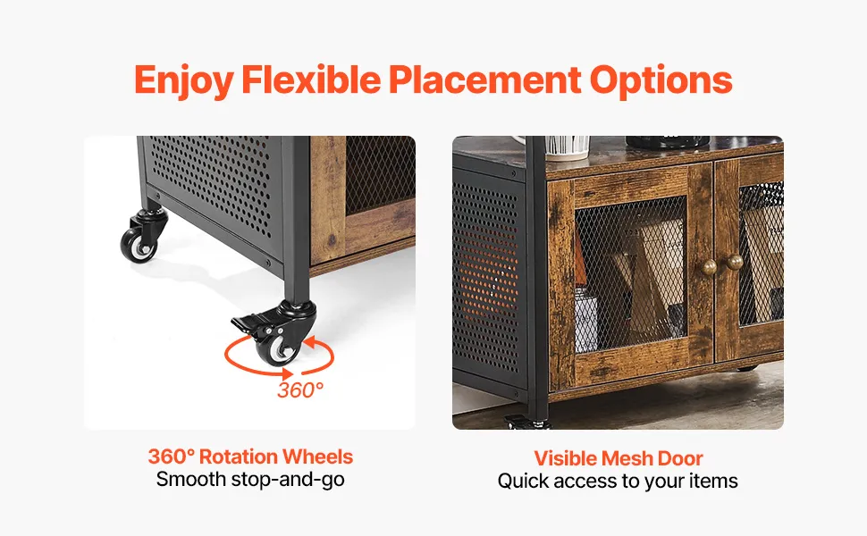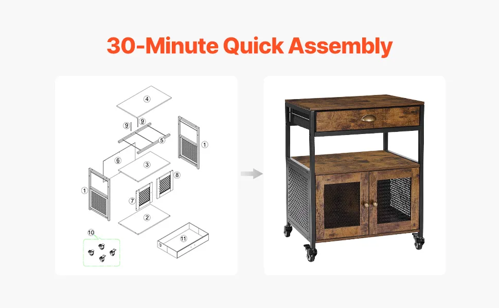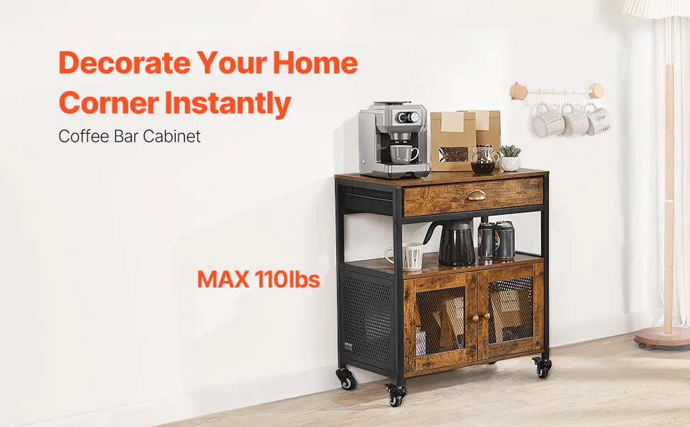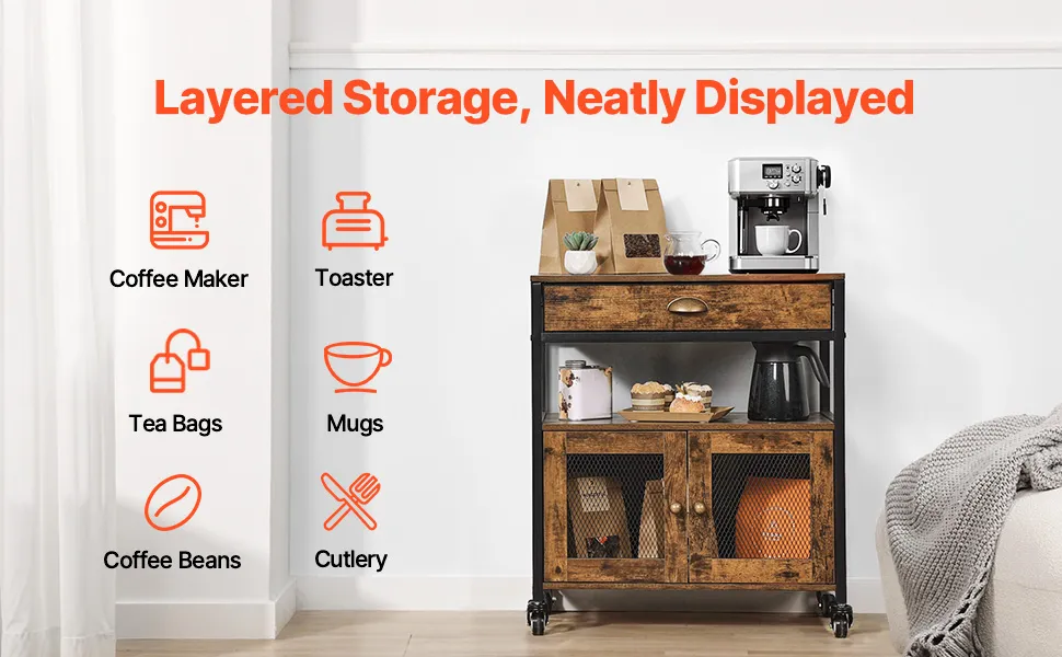 Einfache Einrichtung & Verwendung: Der Zusammenbau dieses Kaffeestationsschranks ist einfach, mit klaren Anweisungen und beschrifteten Teilen. Er verfügt über glatte, leise Rollen für einfache Bewegung und Bodenschutz, mit zwei feststellbaren Rollen, um ihn an Ort und Stelle zu halten. Die Netztüren bieten Sichtbarkeit für einfachen Zugriff auf Ihre Artikel