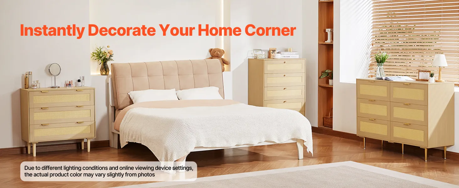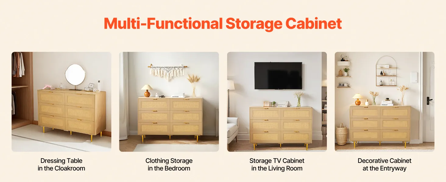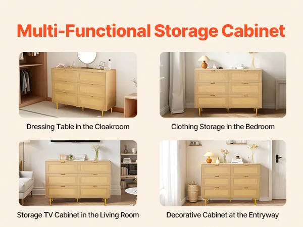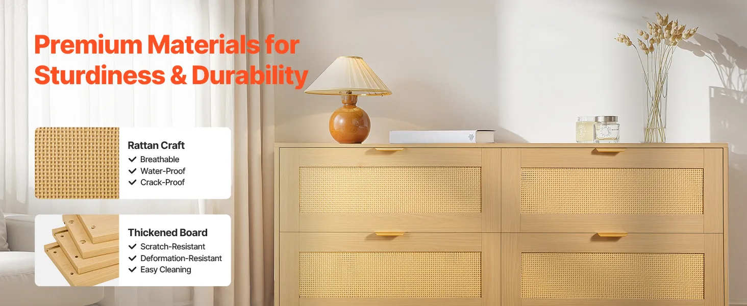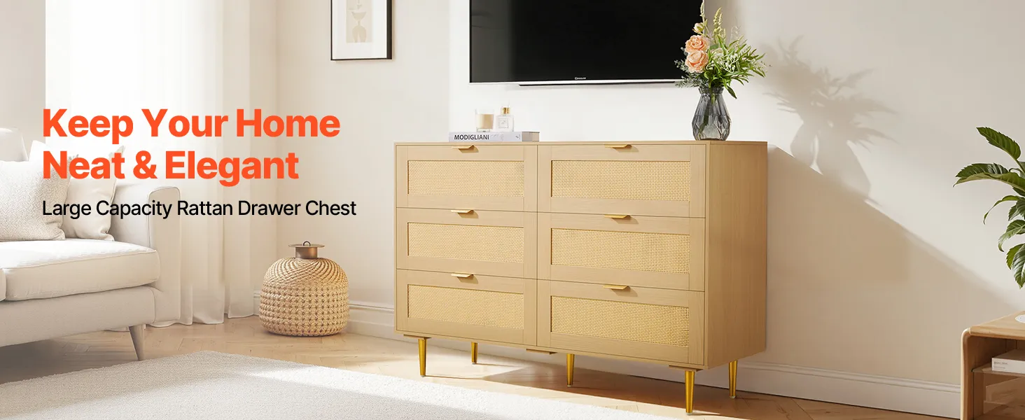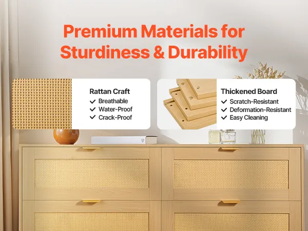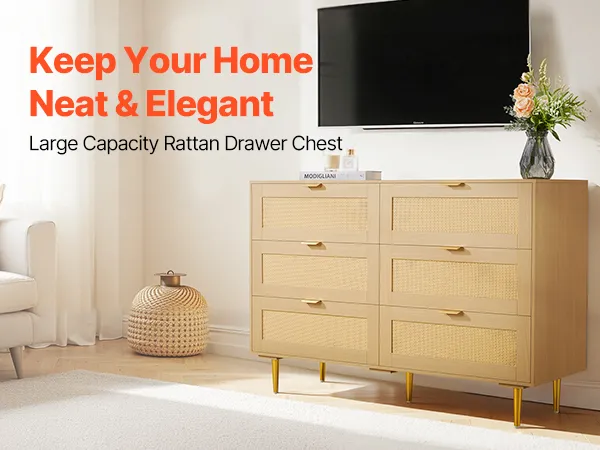 Robust & langlebig: Unsere Rattankommode aus Spanplatte ist verschleißfest, kratzfest und biegefest. Die Rollen sorgen für ein sanfteres Gleiten, während die 6 Zoll (15,2 cm) langen Metallbeine den Schrank trocken halten und einen einfachen Zugang zum Staubsauger ermöglichen