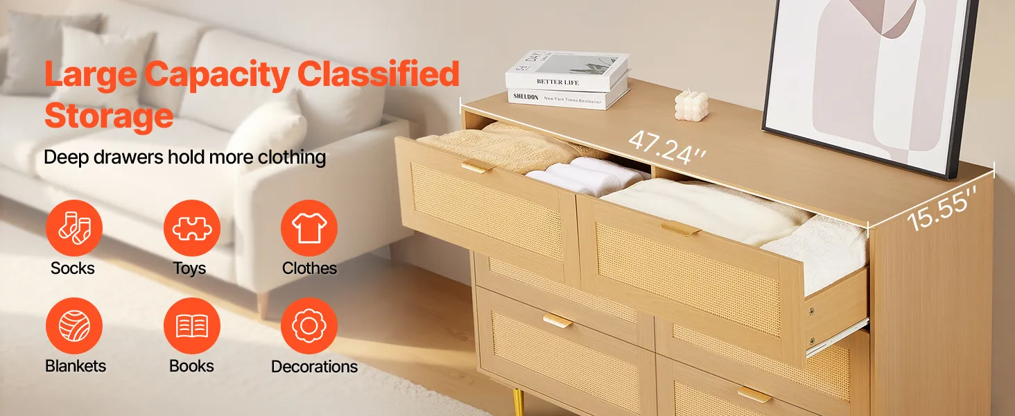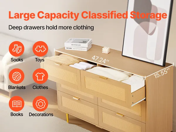 Geräumige Rattankommode: Diese Rattankommode für das Schlafzimmer verfügt über sechs Schubladen mit jeweils 8,7 Zoll (22,2 cm) Tiefe und bietet reichlich Stauraum für Kleidung, Bücher, Decken und Spielzeug. Die breite Oberfläche eignet sich ideal zum Präsentieren von Fotorahmen und Dekorationen