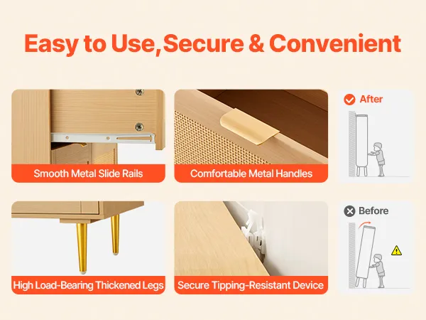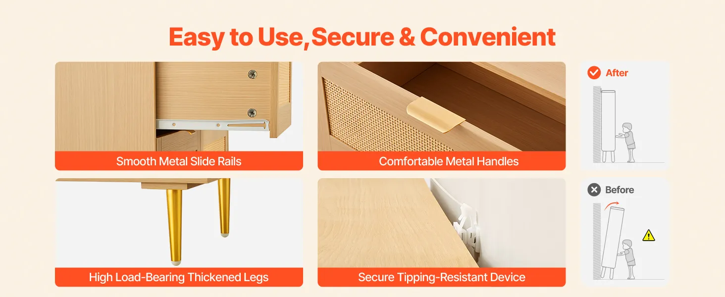 Sicher & stabil: Unser Rattanschrank trägt stabil bis zu 66 lbs (30 kg) oben und 22 lbs (10 kg) pro Schublade. Die Kippsicherung sorgt für mehr Sicherheit und Stabilität. Bitte installieren Sie die Kippsicherung vor Gebrauch