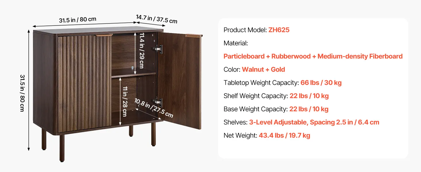 VEVOR Sideboard Küchenschrank mit 2 Ablageflächen, Buffetschrank im mittelalterlichen Stil für Wohnzimmer Eingangsbereich Küche, Aufbewahrungsschrank 80 x 37,5 x 80 cm Walnuss Küchenbuffet