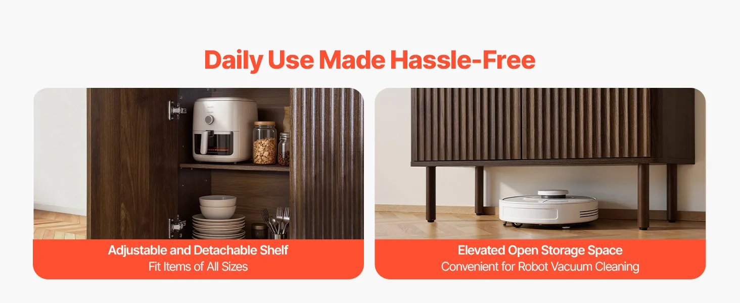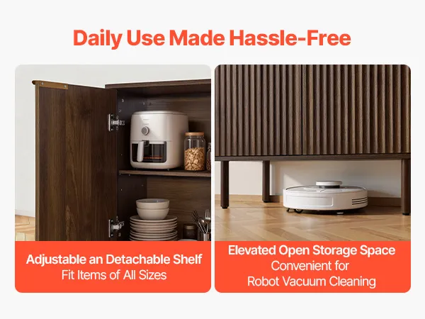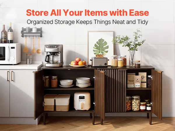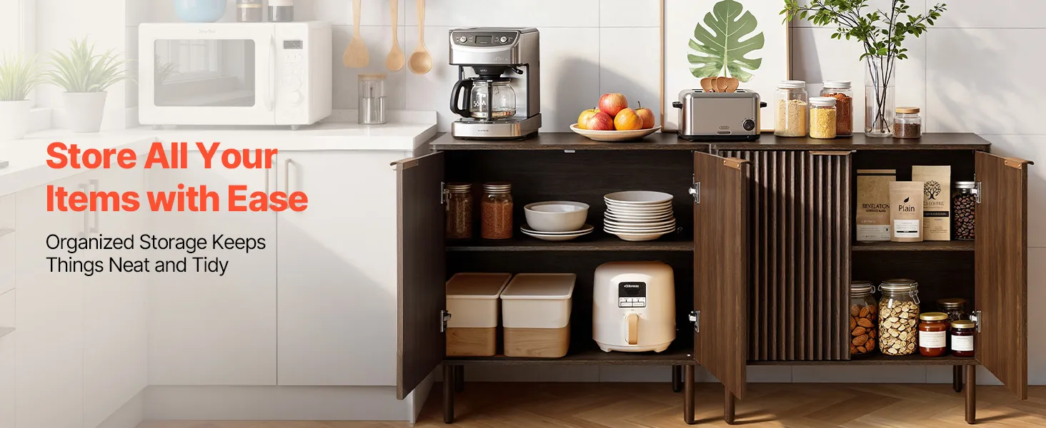 Vielseitiger Stauraum: Das Buffet verfügt über versteckte Seitenfächer mit verstellbaren und herausnehmbaren Einlegeböden und bietet drei Höhenoptionen. Hier lassen sich Geschirr, Gläser und Küchenutensilien verstauen, während die breite Tischplatte Platz für Kaffeemaschine, Toaster oder Dekoration bietet.