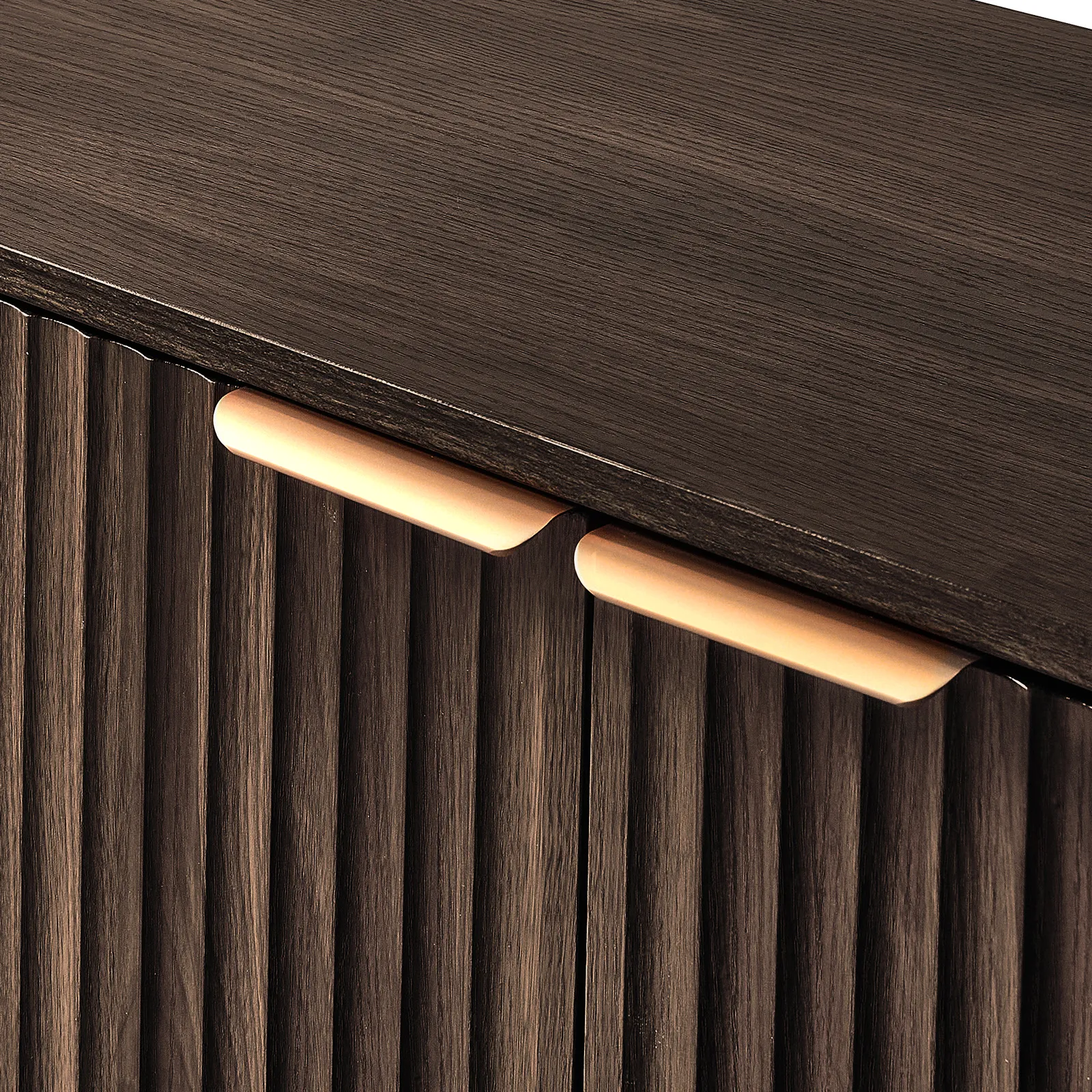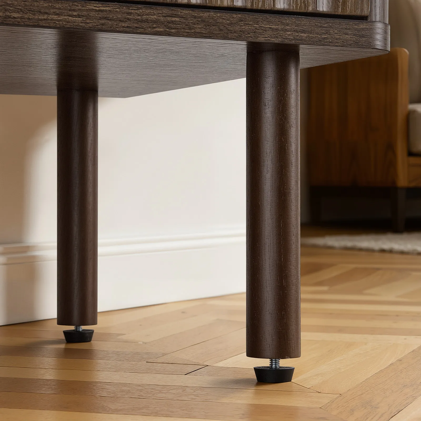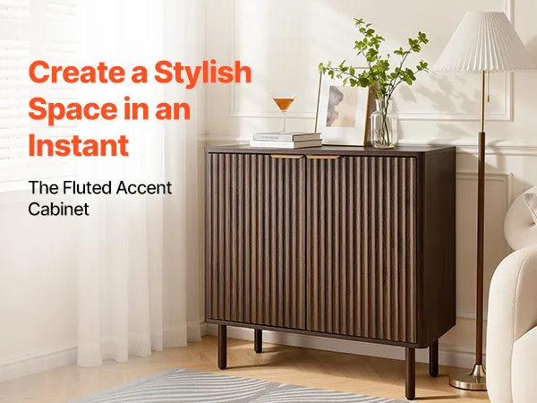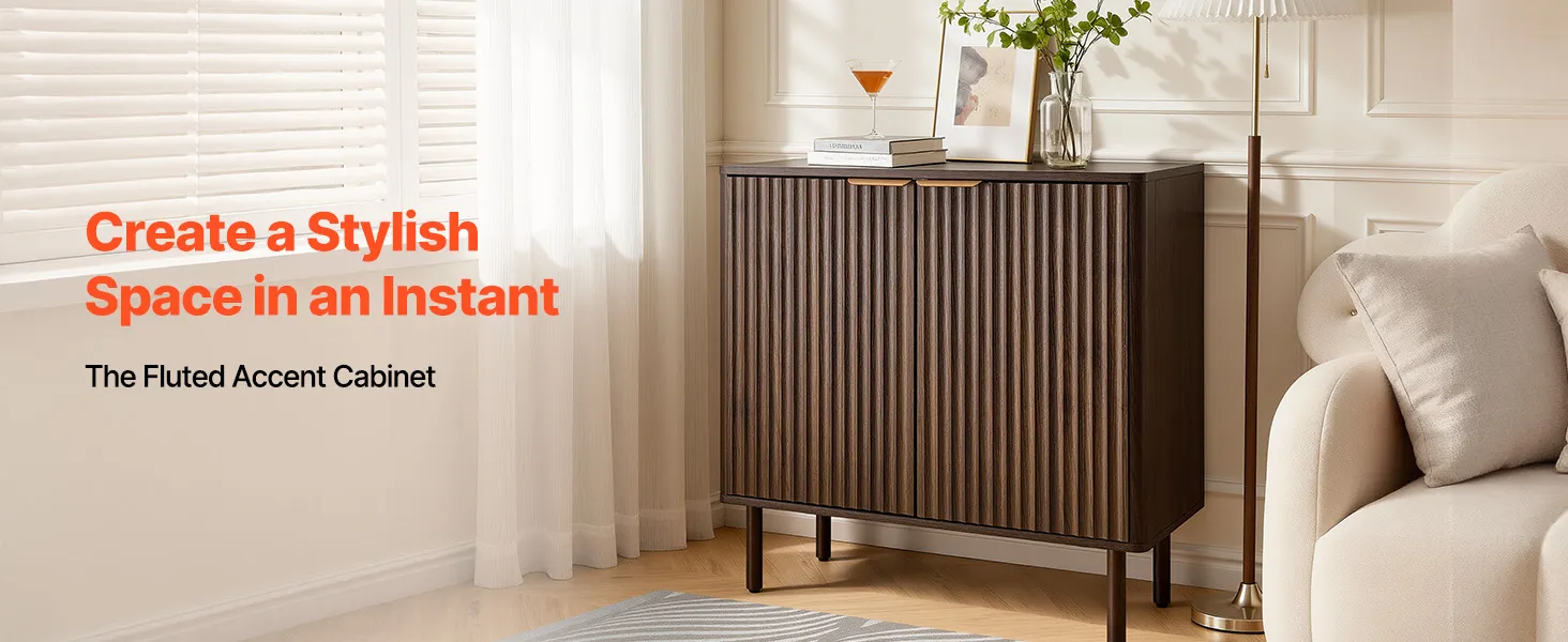 Elegantes & geriffeltes Design: Dieser Küchenschrank besticht durch vertikal geriffelte Paneele und eine schlanke, geschwungene Silhouette, die Ihrem Zuhause Eleganz verleiht. Natürliche Holzoberflächen und Metallgriffe verbinden zeitgenössische und mittelalterliche Elemente und machen es zu einem stilvollen Dekorationsmöbelstück