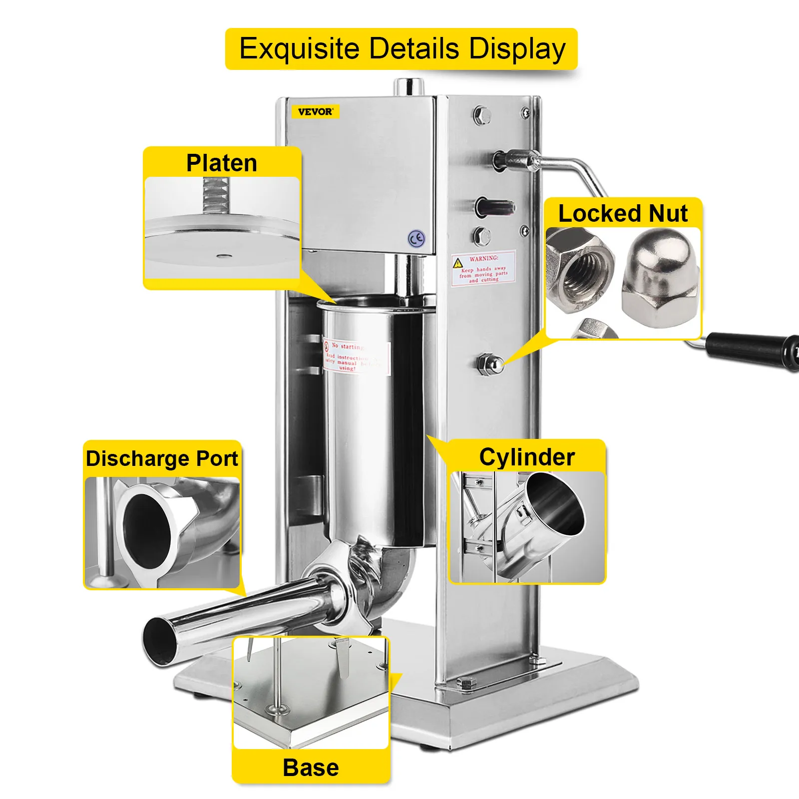 Mit einem großen Fassungsvermögen von 10 L kann der Wurstfüller aus Edelstahl viele Würste auf einmal herstellen. Und der Zylinder hat ein kippbares Design. Sie können die Materialien direkt einfüllen und schnell mit der Herstellung von Würsten beginnen.