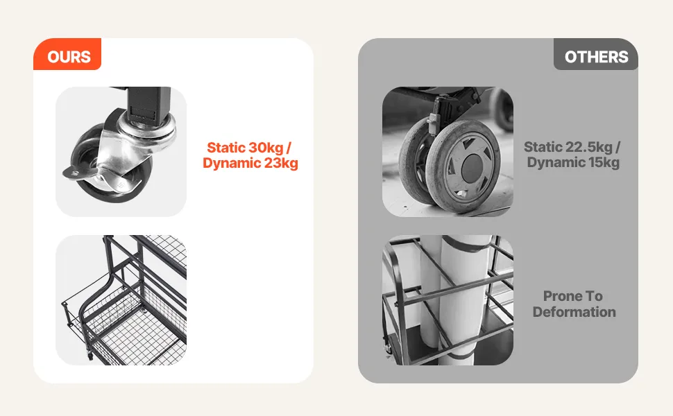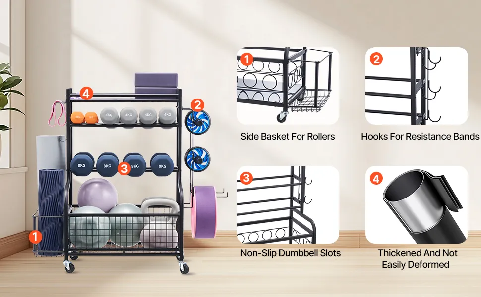 Es bietet verschiedene Aufbewahrungsmöglichkeiten und -methoden und maximiert die Aufbewahrungskapazität für Ihre Trainingsausrüstung. Ausgestattet mit vier robusten 360-Grad-Rollen (zwei davon feststellbar) erfüllt er Ihre Anforderungen an Mobilität und Stabilität.
