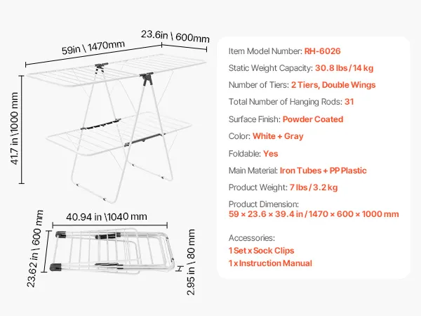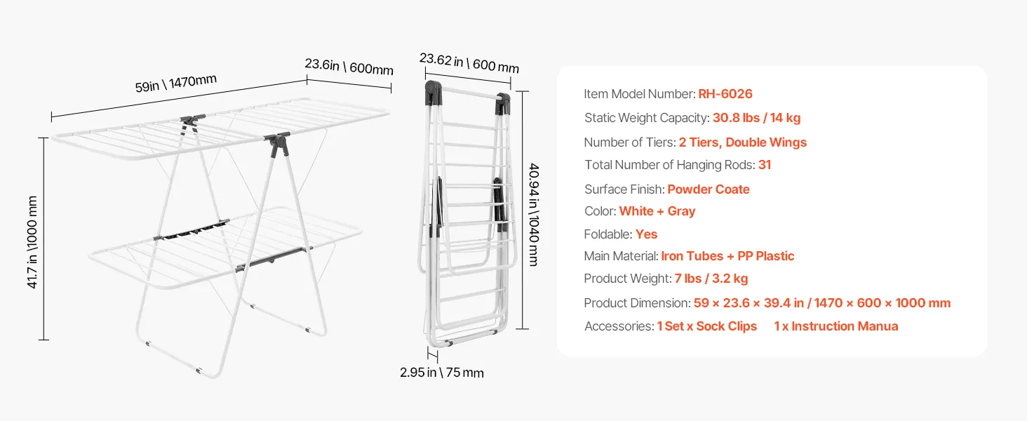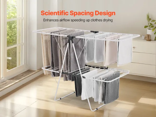 Große Kapazität: Das geräumige zweistöckige Doppelflügeldesign mit 31 Aufhängestangen bietet reichlich Platz zum Aufhängen und Trocknen von Kleidung, Hosen, Schals, Handtüchern, Socken und Decken