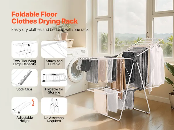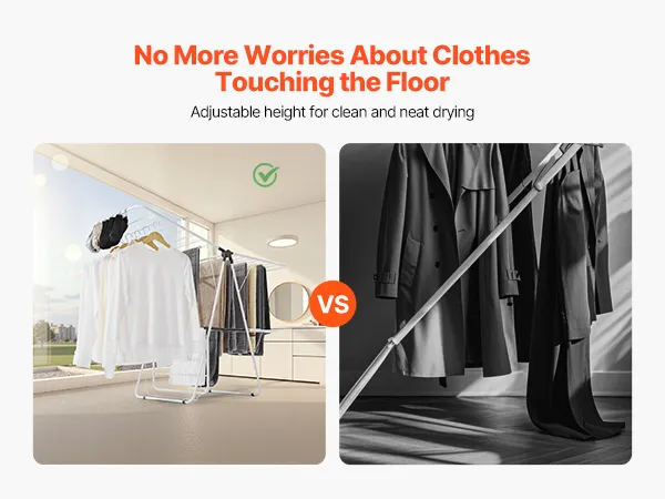 Die Höhe ist verstellbar, wodurch er sich ideal zum Trocknen verschiedener Kleidungsstücke wie Kleider, Hemden und Bettwäsche eignet. Hält die Kleidung vom Boden fern und sorgt dafür, dass sie trocken und sauber bleibt.