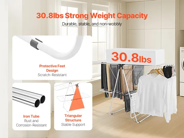 Mit einer beeindruckenden Tragkraft von 14 kg steht er stabil und wackelfrei. Der Eisenrohrrahmen in Kombination mit der dreieckigen Struktur sorgt für festen Halt und sicheres Trocknen. Die Unterseite ist mit Schutzfüßen ausgestattet, um Bodenschäden zu vermeiden.
