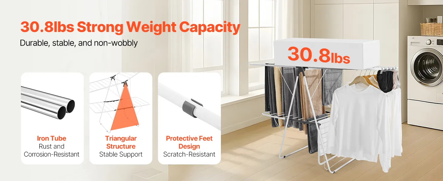 Premium-Material: Hergestellt aus hochwertigen Eisenrohren und PP-Kunststoff, korrosions- und rostbeständig, mit einer Tragkraft von 30,8 lbs (14 kg). Bewältigt problemlos verschiedene Trocknungsanforderungen und stellt sicher, dass der Wäscheständer auch bei längerem Gebrauch stabil bleibt
