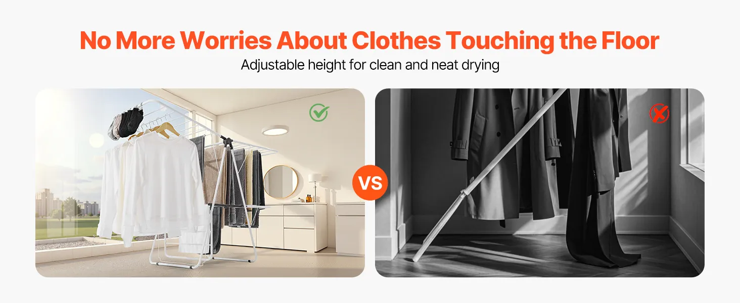 Einstellbare Trockenhöhe: Einstellbarer Höhenbereich von 44,9 bis 52,4 Zoll (114 cm bis 133 cm), um den Trocknungsanforderungen von Kleidung unterschiedlicher Länge gerecht zu werden. Ob Hemden, Hosen oder Bettlaken, Sie finden die richtige Aufhängehöhe