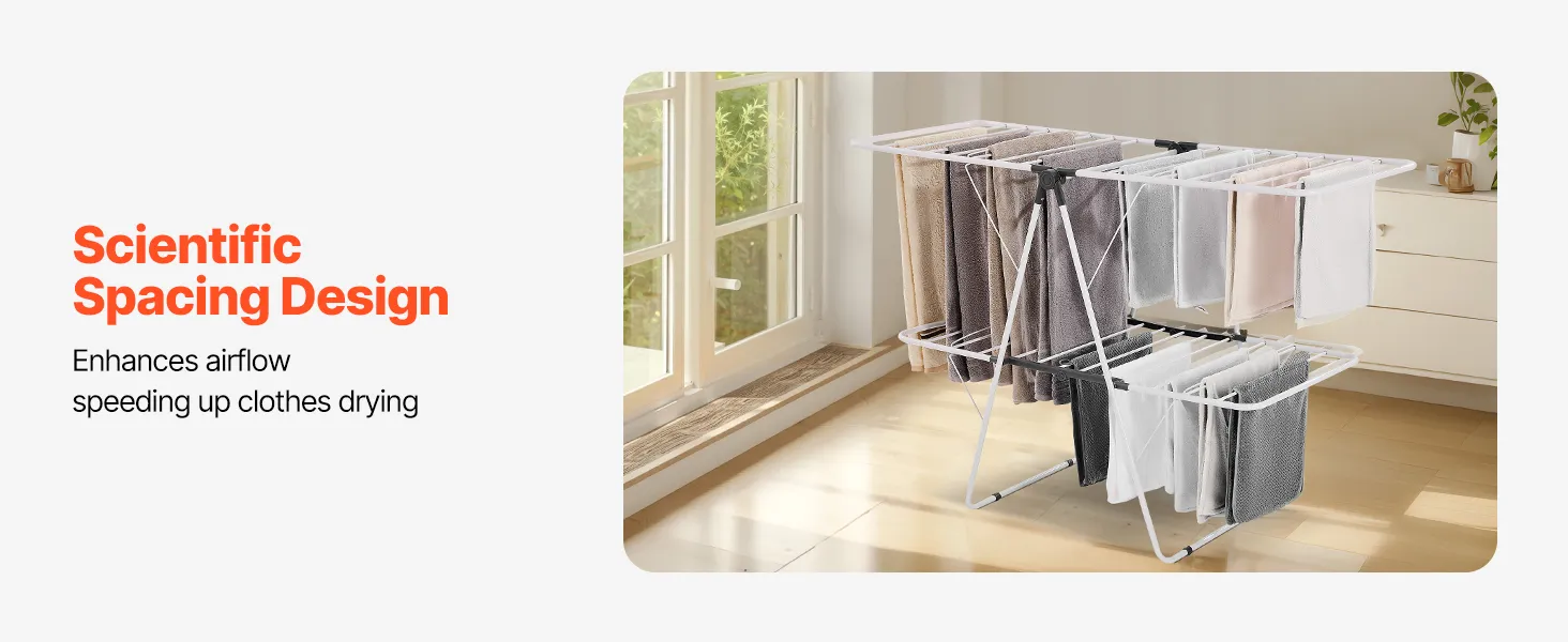 Die wissenschaftlich konzipierten Abstände ermöglichen eine bessere Luftzirkulation und beschleunigen so die Trocknungszeit. Jedes Kleidungsstück erhält maximale Luftzufuhr und trocknet schneller und effizienter.