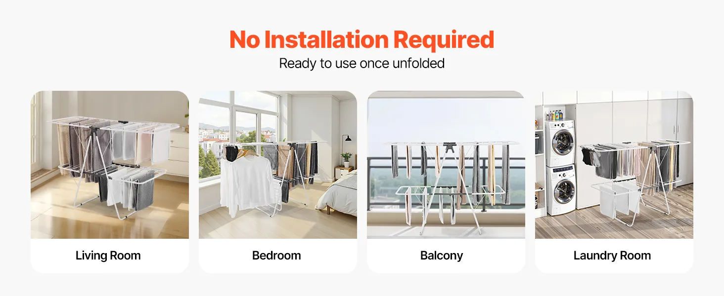 Das Schnellfaltdesign erfordert keine Montage – einfach aufklappen und los geht‘s. Ob im Wohnzimmer, Schlafzimmer, auf dem Balkon oder in der Waschküche – es lässt sich leicht aufstellen und ist jederzeit einsatzbereit.