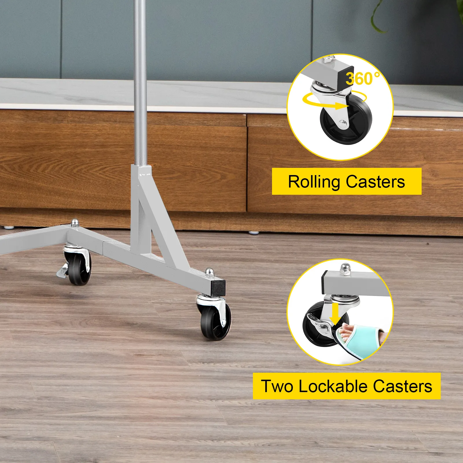 Dieser rollende Kleiderständer ist aus hochbelastbarem Stahl gefertigt, der stark genug ist, um Ihre schweren Kleidungsstücke zu halten, während 1,2 mm dicke Rohre für zusätzliche Stabilität sorgen. Der tragbare Kleiderständer kann mit vier Lenkrollen leicht bewegt werden, und zwei feststellbare Rollen sorgen für zusätzliche Stabilität. Er ist auch leicht aufzustellen und zu lagern, die perfekte Lösung zur Aufbewahrung von Kleidung für Ihr Haus.