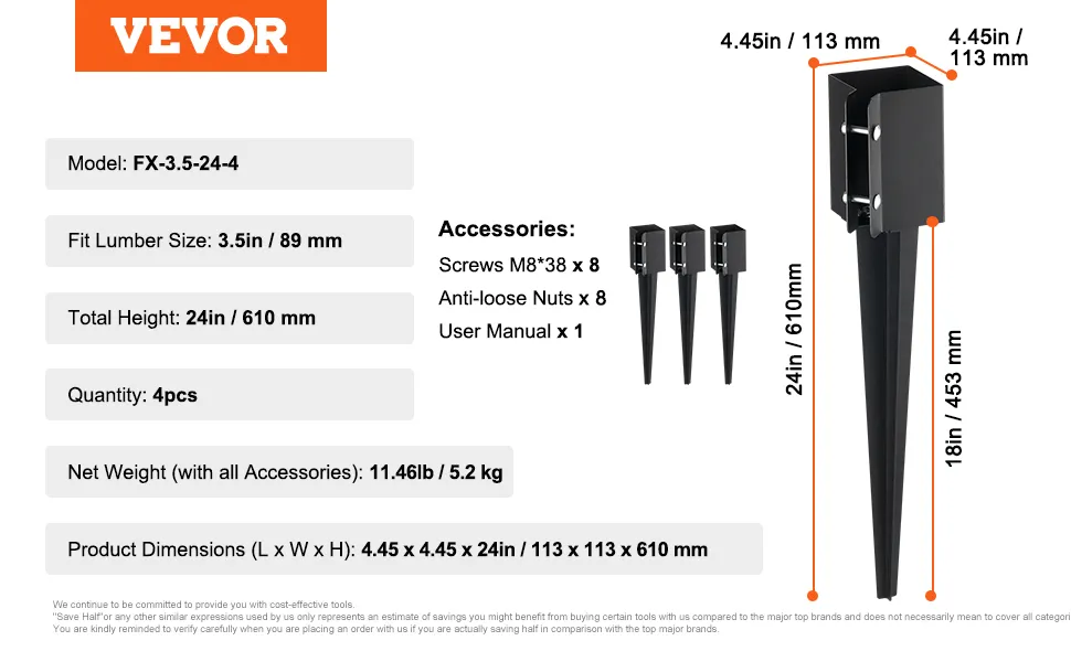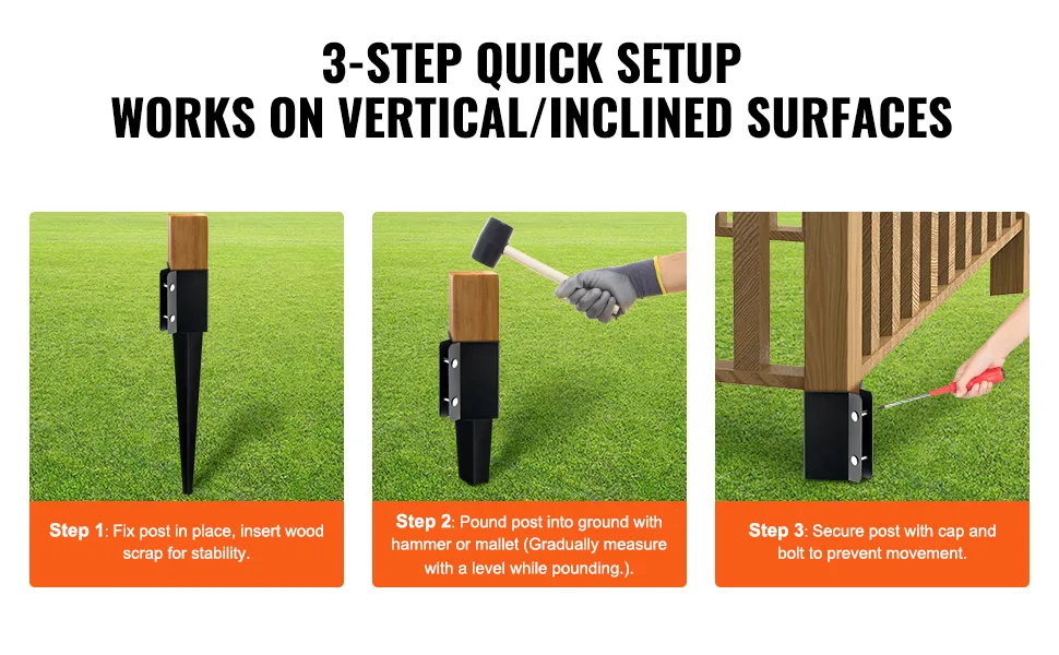 Der VEVOR-Zaunpfostenanker ist einfach zu installieren. Das Set enthält alle für die Installation erforderlichen Komponenten. Es enthält mehrere Muttern und Schrauben, die einen festen und sicheren Sitz mit 3,5-Zoll-Holzpfosten gewährleisten. Eine einfache Installation spart Zeit und Mühe. Es sind keine Spezialwerkzeuge oder Fähigkeiten erforderlich. Der einfache Aufbau macht ihn für jedermann zugänglich. Die einfache Installation trägt zum allgemeinen Komfort des Produkts bei. Sie können Ihre Außenstrukturen schnell und effizient sichern.