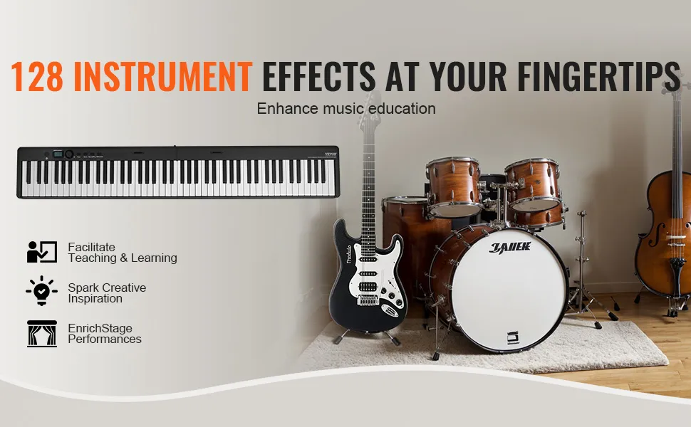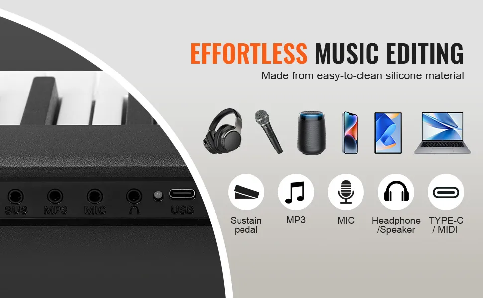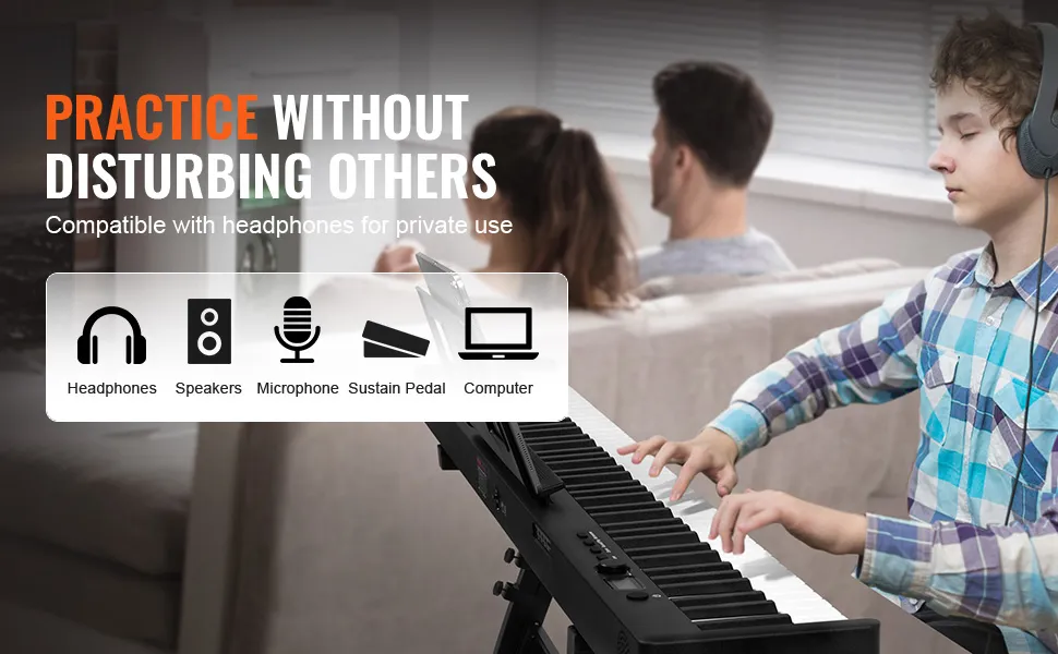Dank der speziellen Kopfhörerbuchse können Sie mit unserem tragbaren Keyboard üben, ohne andere zu stören. Darüber hinaus können Sie über den Mikrofoneingang auf einem tragbaren Piano-Keyboard spielen und mitsingen, was Ihre Sitzungen noch dynamischer und unterhaltsamer macht.