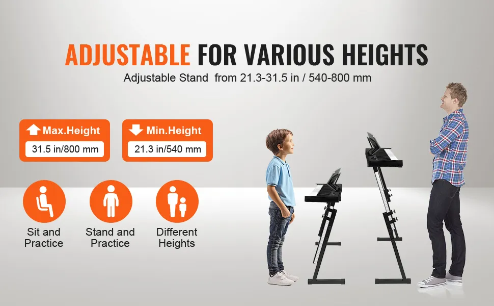 Verstellbarer Ständer, stabiler Halt: Erleben Sie verbesserte Stabilität mit unserem gleichmäßig ausbalancierten Ständer, der das Risiko eines Wackelns oder Umkippens Ihres tragbaren Keyboard-Pianos minimiert. Er ist von 540 bis 800 mm (21,3 bis 31,5 Zoll) verstellbar und auf verschiedene Höhen zugeschnitten. So ist ein sicherer Stand für Ihren Komfort und Ihre Seelenruhe gewährleistet.
