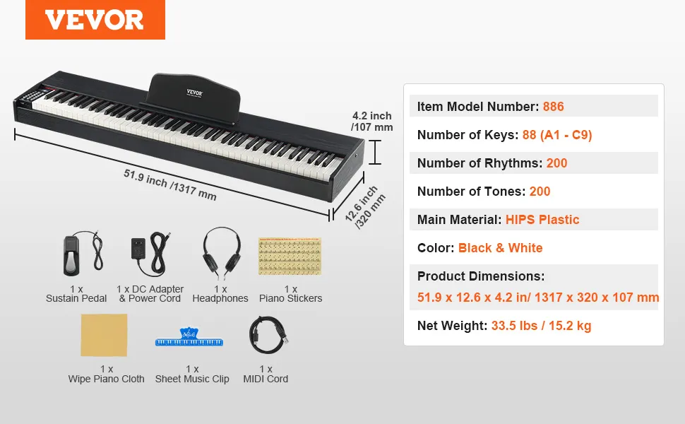 VEVOR Digitalpiano, 88 Tasten, Elektrisches Klavier, Doppeltastatur und Lautsprecher mit Sustain-Pedal, Kopfhörer, 200 Töne und Rhythmen, unterstützt Bluetooth/USB/MIDI, für Anfänger und Lehrer