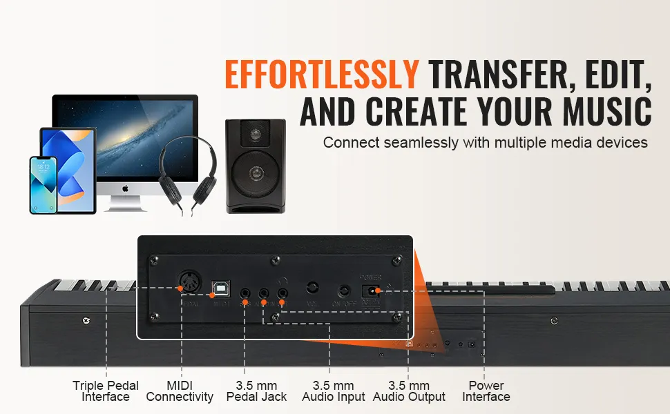MIDI- und Bluetooth-Übertragung: Die verschiedenen Übertragungsmethoden des 88-Tasten-Pianos ermöglichen eine effiziente Verbindung. Ausgestattet mit Audioausgang, Mikrofonanschluss und Audioeingang, sodass Sie Kopfhörer anschließen können, um intensiv zu lernen, ohne Ihre Nachbarn zu stören. Stabiler Notenständer für bequemes Lesen. Klavieraufkleber im Lieferumfang enthalten, um die Tasten schnell zu identifizieren.