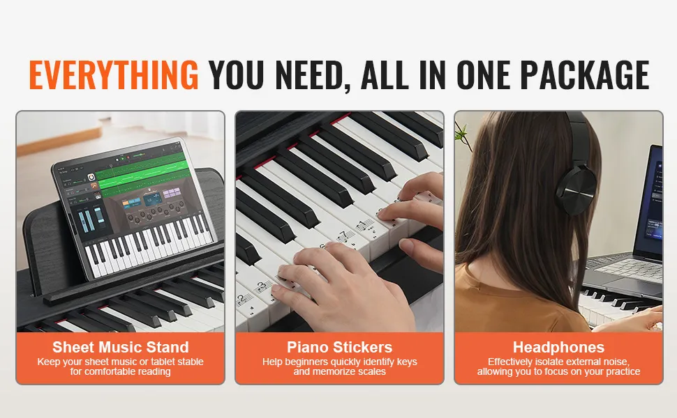 Das gewichtete Digitalpiano mit 88 Tasten wird mit einem Notenständer geliefert, damit Sie Ihre Notenblätter oder Ihren flachen Computer stabil und bequem lesen können.