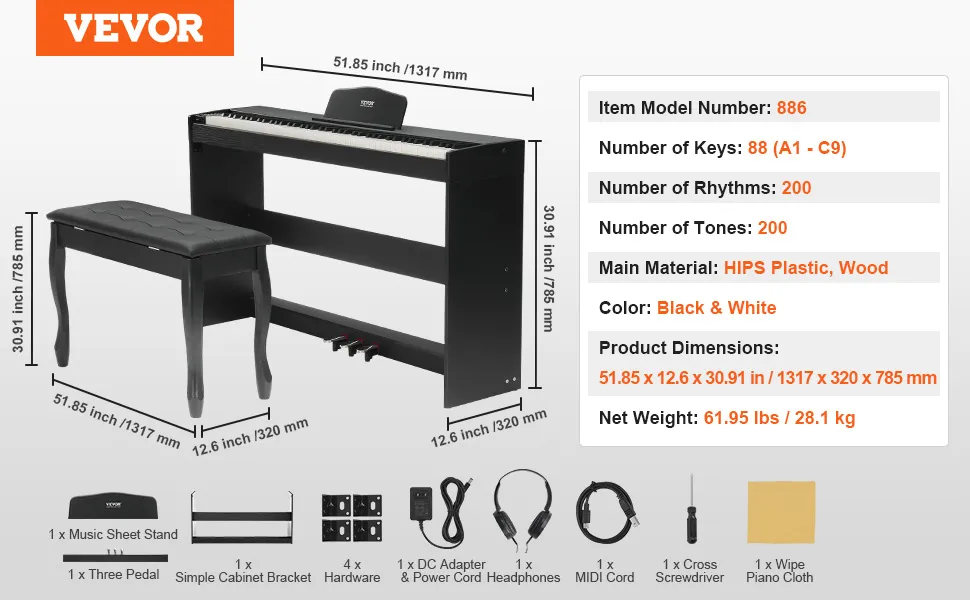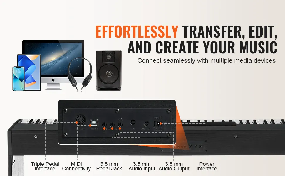 MIDI- und Bluetooth-Übertragung: Die verschiedenen Übertragungsmethoden des 88-Tasten-Pianos ermöglichen eine effiziente Verbindung. Ausgestattet mit Audioausgang, Mikrofonanschluss und Audioeingang, sodass Sie Kopfhörer anschließen können, um intensiv zu lernen, ohne Ihre Nachbarn zu stören. Stabiler Notenständer für bequemes Lesen. Klavieraufkleber im Lieferumfang enthalten, um die Tasten schnell zu identifizieren.