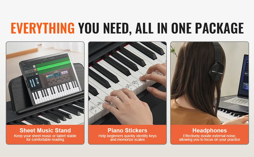 Das gewichtete Digitalpiano mit 88 Tasten wird mit einem Notenständer geliefert, damit Sie Ihre Notenblätter oder Ihren flachen Computer stabil und bequem lesen können.