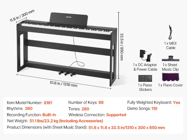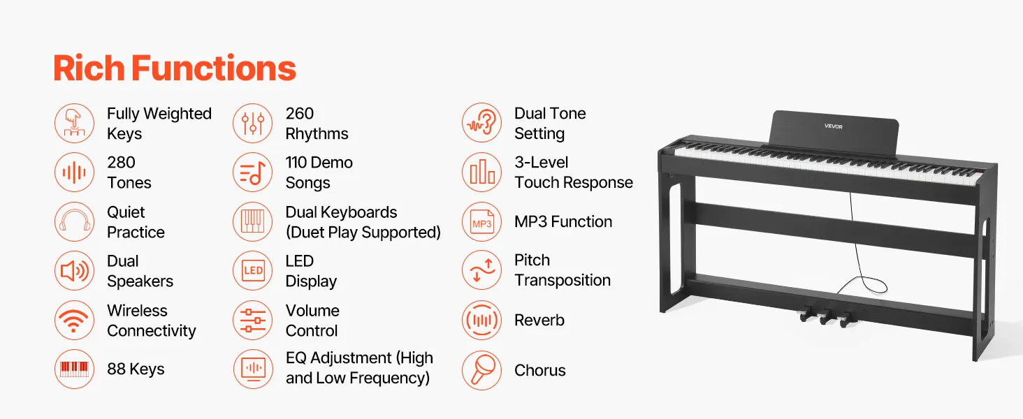 Smart Learning Experience: This electric piano 88 keys weighted supports wireless connectivity and various apps and devices. It brings 260 rhythms, 280 tones, and 110 demo songs, making learning easy and efficient
