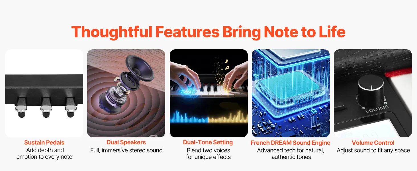 The sustain pedal extends note duration, making legato playing effortless. With dual speakers, dual-tone setting, and the French DREAM sound engine, this electric piano 88 keys weighted delivers rich, authentic sound, meeting the needs of every player.