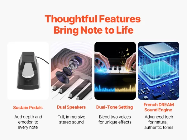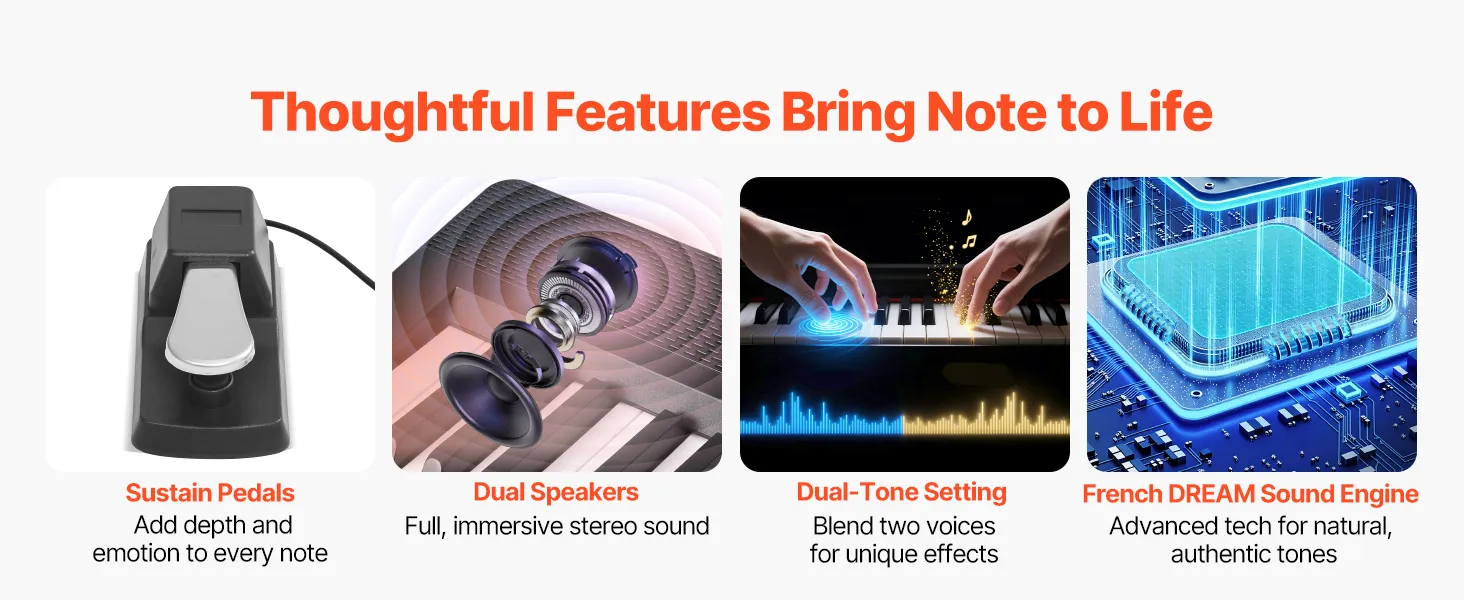 Das Haltepedal verlängert die Notendauer und ermöglicht müheloses Legato-Spielen. Mit zwei Lautsprechern, einer Zweiklangeinstellung und der französischen DREAM-Sound-Engine liefert dieses E-Piano mit 88 gewichteten Tasten einen satten, authentischen Klang, der die Bedürfnisse jedes Spielers erfüllt.